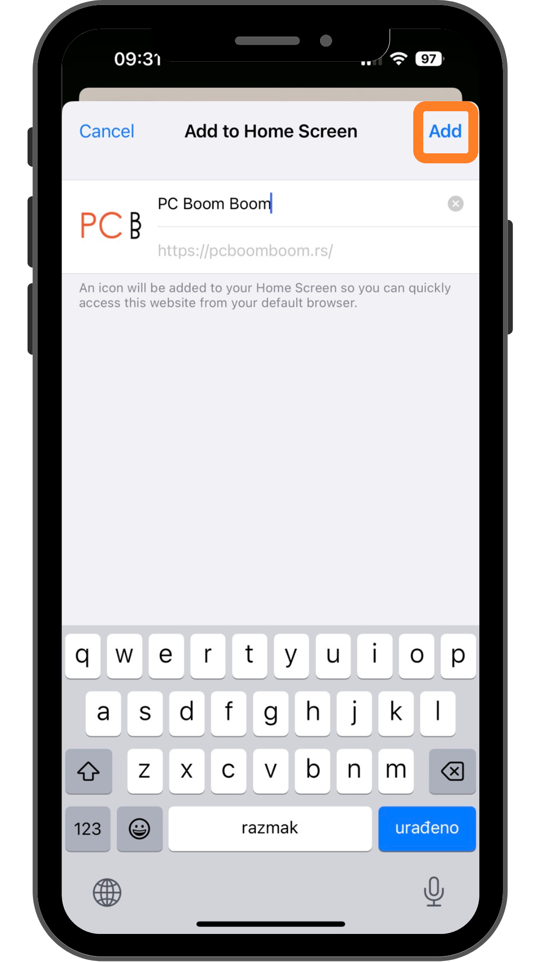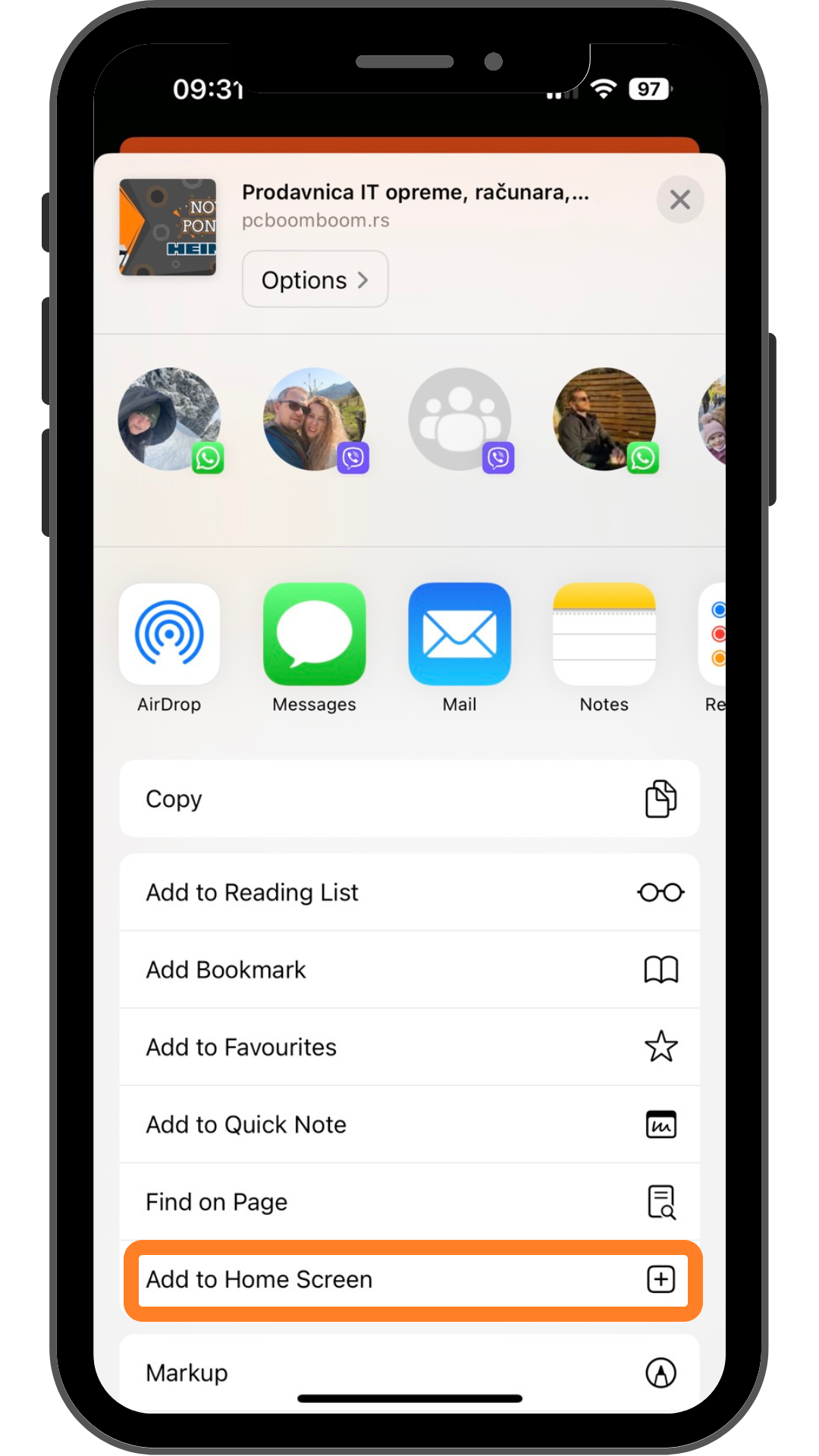 U meniju izaberite opciju: Add to Home Screen / Dodaj na početni ekran.