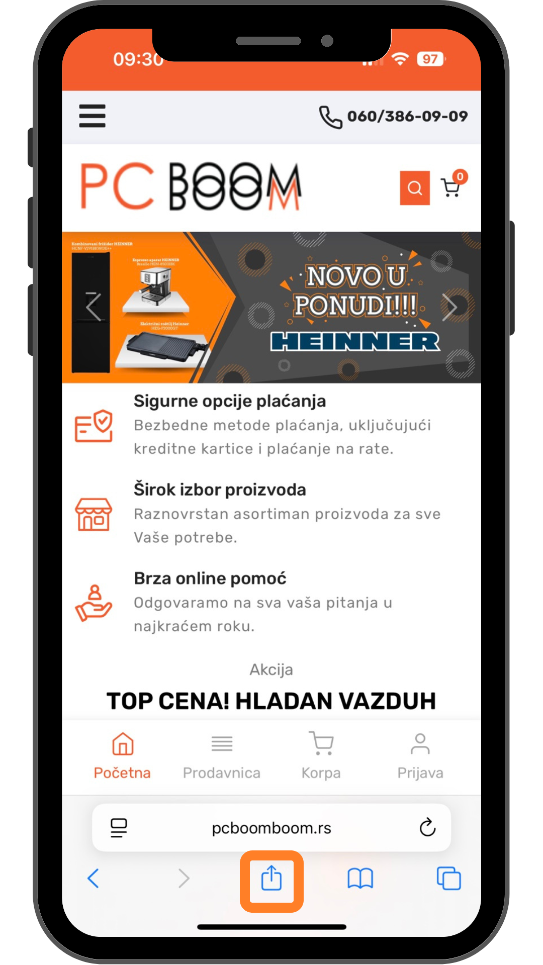 Kliknite na Share dugme (ikonica kvadrata sa strelicom nagore).