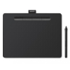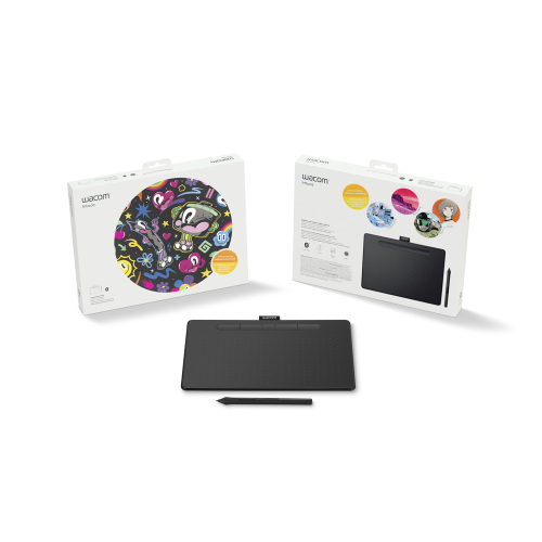 Intuos M Bluetooth Black je grafička tabla izrađena od kvalitetne plastike (PC+ABS) sa integrisanom baterijom koja podržava 15 h rada u kontinuitetu (vreme punjenja baterije 3.5 h).U pakovanju se nalazi: Intuos M Bluetooth Black - grafička tabla za crtanje;Wacom Pen 4K - digitalna olovka dimenzija 143.2 x 12 mm, bez baterije, osetljiva na pritisak (4096 nivoa), radi na principu metode elektromatične rezonance;3 Standard black nibs - rezervni vrhovi za digitalnu olovku;Nib removal tool - alat za uklanjanje vrhova;USB kabl dužine 1.5 m za povezivanje table sa računarom i punjenje;Uputstvo za brzo pokretanje.