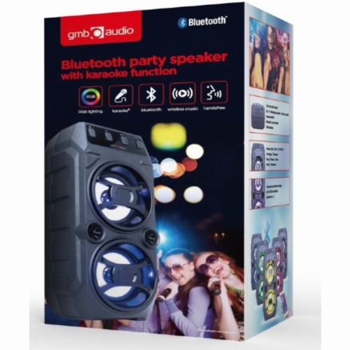 Kompaktan prenosni dizajn sa LED pozadinskim osvetljenjemSavršeno za vaš mobilni telefon ili tabletPrenosivi Bluetooth zvucnik sa funkcijom za karaokePoseduje FM radio -Bežicno prenosite muziku, signal do 10m-6,35 mm uticnica za jednostavno povezivanje mikrofona-Višebojni LED svetlosni efekat treperi i menja boju-Takode reprodukuje muziku direktno sa micro SD kartice, USB stick (max 32GB) ili AUX preko microUSB konektora ulaza-Dug vek baterije - do 6 sati prenošenja muzike sa jednim punjenjemInterfejs: Bluetooth v.5Bluetooth frekvencijski opseg: 2.402 GHz - 2.480 GHzZvucnici: 3 Ohm, precnik 75mmRMS snaga: 2x5WFrekvencijski odziv: 150Hz - 18KHzS / N odnos:> 80 db, TDH + N <10%Podrška za MicroSD kartice: do 32 GBUSB-AF port: podrška za fleš disk do 32 GBMicroUSB ulazMIC ulaz: 6,35mmDC ulaz: MicroUSB 5 VDC do 1 ABaterija: punjiva baterija od 1200 mAhVreme punjenja: 3 sataDimenzije: 133x100x256mmNeto težina: 0,65kg