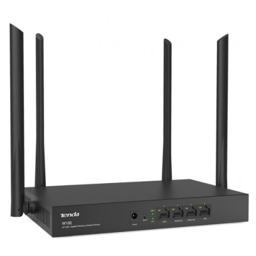 Smart Bandwidth ControlW18E features with smart bandwidth management. It will adjust each user's download and upload bandwidth automatically according to all users bandwidth usage to avoid bandwidth insufficient.Multi WAN Load BalanceW18E supports 3 WAN ports. It can realize bandwidth averaging between two WAN ports base IP Group. Also it reserve the possibility of bandwidth expansion in the future.PPTP/L2TP/IPSec ServerW18E supports multiple VPN protocols including IPsec, PPTP and L2TP in Client/Server mode. It is easily to setup a secure data link between branch and headquater through LAN-to-LAN/Client-to-LAN mode.RAM 128MBFlash 8MBInterface 4*GE(1~3 WAN/ 1~3 LAN)Maximum Power Consumption 12WButton 1* Reset buttonPower 12V 1ADimension(LxWxH) 220*135*30mmWireless:Frequency 2.4GHz\5GHzWireless Speed 300+867MbpsSoftware:Maximum user capacity 80Maximum Wifi user capacity 50Internet Connection TypePPPoE/DHCP/Static IP/Russian L2TP/India (PPPoE supports server name customization)Authrization ServiceCaptive Portal/Facebook AuthenticationCaptive Portal 50 Portal AccountsCustomize E-bulletin Backbound BandwidthSmart Bandwith Control Manual DefinitionInternet Access Control IP/mac/URL FilterVPN Protocal PPTP/L2TP/IPSECPort Forwarding:Port ForwardingDMZSecurity SettingIP-MAC BindingARP Attack ProtectionDDNS no-ip/dyndnsUPNP SupportFirmware Upgrade Local/online UpgradeSystem Tool:Schedule RebootRestore or Backup ConfigurationNetwork Status ViewTraffic StatisticsNetwork structure topologyOthersPackage ContentsWireless Router*1Power Adapter *1Install Guide*1Web Login Address tendawifi.com or 192.168.0.252OperatingTemperature 0? ~ 40?Storage Temperature -40? ~ 70?Operating Humidity 10% ~ 90% RH non-condensingStorage Humidity 5% ~ 90%RH non-condensingCertificates CE/FCC/RoHS