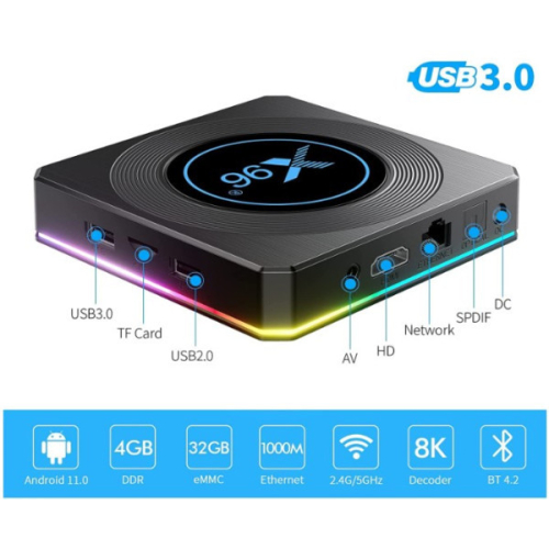 Android 11.0 OS i mocan S905x4 cipsetX96 X4 android TV BOX ima najnoviji android 11.0 OS i pokrece jaci S905X4 cetvorojezgarni 64-bitni Cortex-A55, koji je stabilniji i brži, brzina procesa je veca od prethodne verzije. Android 11 tv box ima savršene performanse u ucitavanju softvera, igranju igrica i samom korišcenju.Dual WiFi 2.4G/5GHz & 10/100M EthernetAndroid TV BOX 11.0 podržava 2.4/5GHZ Dual-WIFI i 10/100Mbps Ethernet LAN, pružajuci stabilniji, super-brzi i jaci WiFi signal za strimovanje slike visokog kvaliteta, smanjujuci zamrzavanje i buffer. BT 4.2 pruža pogodnost za povezivanje bežicnih uredaja, cineci vaš život pametnijim.4GB RAM 32GB ROM & USB 3.0TV BOX dolazi sa 4GB RAM 32GB ROM memorije koji ima dovoljno prostora za pokretanje aplikacija i ucitavanje video zapisa. Takode možete proširiti prostor za skladištenje putem dodatnog cvrstog diska, mikro SD kartice ili eksternog USB uredaja (do 128GB), ne brinite o smrzavanju ili zujanju zbog nedostatka memorije. USB 3.0 ima prednost velike brzine prenosa.3D 8K HDR & AV1 dekodiranjePodržava 8K Ultra HD rezoluciju i novu tehnologiju dekodiranja AV1 (AV1 je 30% bolji od H.265 ili VP9), striming slike je glatkiji i jasniji. 3D dinamika donosi realisticne vizuelne efekte. Novi savremeni dizajn sa osvetljenjemX96 X4 android tv box sadrži svetla ciji LED efekat se može ukljuciti i iskljuciti, možete podesiti razlicite režime u skladu sa vašim raspoloženjem, uciniti vaš život šarenim.TV Box X96 X4Android 11,0Procesor Amlogic S905X4RAM: 4GBROM 32GBHardverske karakteristike boxa TV Box X96 X4:CPU – Amlogic S905X4 2.0GHz 64-bitGPU – ARM Mali-G31MP2RAM – 4GB DDR3ROM – 32GB eMMcWifi – IEEE 802.11 a/b/g/n/ac ; 2.4G +5.8G WIFILAN – 100MbpsBluetooth – 4.2Dostupni portovi na boxu X96 X4:HDMI HDTV 2.1 ,Support HDTV CEC, Dynamic HDR and and 8Kx4K - 1xUSB 2.0 - 1xUSB 3.0 - 1xLAN 100Mbps 10/100M - 1xAV 480i/576i izlaz - 1xSD Card podrzane 4GB/8GB/16GB/32GB/64GB/128GB - 1xSPDIF Optical Audio - 1xstari EAN kod do 25.11.2024 6690120200356