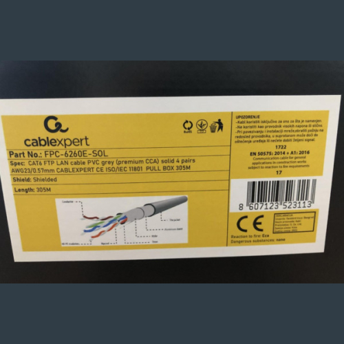 -305 m (1000 ft)/karton UTP CAT5e, napajanje preko Etherneta, kompatibilan sa jednim kablom-Bakarni provodnik oxygen-free visoke cistoce-Prilagodeni PVC spoljni omotac; CE CPR Eca sertifikovana klasa otpornosti na vatruMaterial: Oxygen free copper (99.97% purity)Diameter: 0.45 mm ± 0.01 mmInsulationMaterial: HDPEMin. Average Thickness: 0.18 mmDiameter: 0.81mm±0.1mmColor (4 Pairs): Blue, white/blue; orange, white/orange; green, white/green; brown, white/brownRip CordMaterial: PolyesterSpecification: 500DSheathMaterial: PVCMin. Average Thickness: 0.5 mmDiameter: 4.7 mm ± 0.3 mmColor: WhiteElectricalMax. DC Resistance of a Single Conductor: 12O/100 mMin. Insulation Resistance: 5000MO·kmMax. DC Resistance Unbalance: 2% (pair intra), 4% (pairs inter)Dielectric Strength: No breakdown with 1KV DC for 1 minTransmissionCharacteristic Impedance: 100 ± 15ONear End Cross Talk: =35.30 dB/100 m@100 MHzMax. Attenuation: 24.2 dB/100 m@100 MHzReturn Loss: =20.1 dB/100 m@100 MHzMechanicalTensile Strength: Sheath=13.5 MPa, insulation=16 MPaElongation at Break: Sheath=150%, insulation=300%Installation Bending Radius: >8 times of outer cable diameterConductor Elongation at Break: =10%EnvironmentalShrinkage of Insulation: =5%Color Migration Resistance of Insulation: No migrationSheath Tensile Strength and Elongation at Break after Aging: =12.5 MPa, =100%Low Temperature Bending Test: No cracking after the testHeat Shock Test: No cracking after the testOperating Temperature: –20°C to +60°C (–4°F to 140°F)Installation Temperature: 0°C to +50°C (32°F to 122°F)Storage Temperature and Humidity: –10°C to +40°C (14°F to 104°F), <60% (RH)SecurityVertical Fire Propagation Test: Comply with IEC 60332-1-2PackagingCable Length: 305.0 m (1000.66 ft) ± 1.5 m (4.92 ft)Inner Carton Dimensions: 364.0 mm × 364.0 mm × 216.0 mm(14.33" × 14.33" × 8.50") (L × W × H)Packaging Method: 305.0 m (1000.66 ft) a carton, one master carton with 2 inner cartonsNet Weight: =7.0 kg (15.43 lb)Gross Weight: =8.0 kg (17.64 lb)ComplianceExecutive Standards: Q/DXJ 067-2019, EN50575-2014Certification: CPR Eca