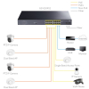 -IEEE 802.3af / 802.3at standard compliant-200-watt total PoE power budget, up to 30-watt per port-16xGbE PoE+Port+2xSFP/GbE Combo Port-CCTV Mode supports remote power&data feeding up to 250M-VLAN mode supports 16 POE+ ports isolated from each other-LED indicators for network diagnostics-19-inch metal case, internal power designConnector Type: 16*10/100/1000M PoE Ports + 2*Gigabit SFP Uplink PortsNetwork Media (Cable): IEEE802.3IEEE802.3uIEEE802.3xIEEE802.3abIEEE802.3zPoE Parameters: PoE Standard: IEEE802.3af /IEEE802.3atMax each port: 15.4W ( IEEE 802.3af )Max each port:30W ( IEEE 802.3at )PoE compatibility: IEEE 802.3af/at adaptivePoE port output: DC48-55VPower Pin : Power over spare pairs 1/2(+) , 3/6 (-)Network Media: 10BASE-T: Cat 5E UTP(=250 meter)100BASE-TX: Cat5 or more UTP (=100 meter)1000BASE-TX: Cat5 or more UTP (=100 meter)Optical: -MultiMode Fiber: 850nm, 1310nm, Transmission Distance: 550m/2Km-Single-Mode Fiber: 1310nm, 1550nm, Transmission Distance: 20/40/60/80/100/120kmPerformance Specification: Bandwidth: 52GbpsMAC: 8KPacket Buffer Memory: 4MPacket Forwarding Rate: 38.7MppsPower Supply Power input: AC100-240V 50/60Hz, Output: 52V3.85A, Power Budget: 200WPWR Power supply indicator (Red)Lighting:PoweredUn-Light:No Power1-26 RJ-45 LINK indicator (Green)Lighting:1000M ConnectUn-Light:100M or Disconnect1-26 RJ-45 ACT indicator (Green)Lighting:ConnectingFlashing:Data TransmitUn-Light:Disconnect