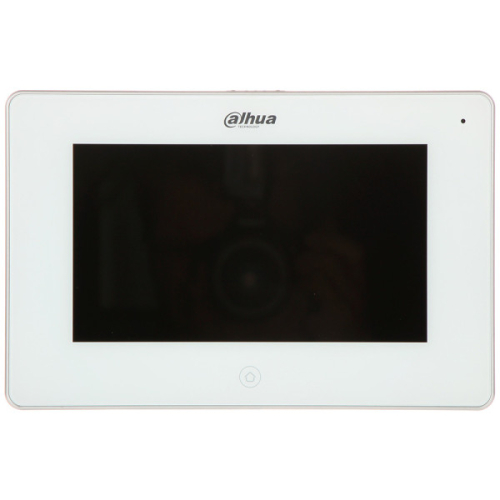 IP Wi-Fi video intercom hands-free monitor, 7" TFT LCD, kapacitivni touch-screen. Rezolucija 1024×600 piksela. Video kompresija H.264. Audio kompresija G.711.Snapshot i Video snimanje (potrebna Micro SD kartica). Video monitoring glavnih i sekundarnih panela. Monitoring do 32 Dahua IP kamere. Kontrola el. brave. SOS funkcija – poziv portiru.Micro SD slot (32GB max.).Dimenzije 215x140x21mm. Masa 0.8kg. 1×10/100Mbps Ethernet port. Wi-Fi IEEE802.11b/g/n. Mrežni protokol TCP/IP. 6 alarmnih ulaza, 1 alarmni izlaz. 1x RS485.Funkcija alarmne tastature/centrale. Potrebno napajanje 12VDC ili PoE(802.3af).Potrošnja do 8W u radnom stanju. Radna temperatura od-10°C do 55°C. Bele boje.