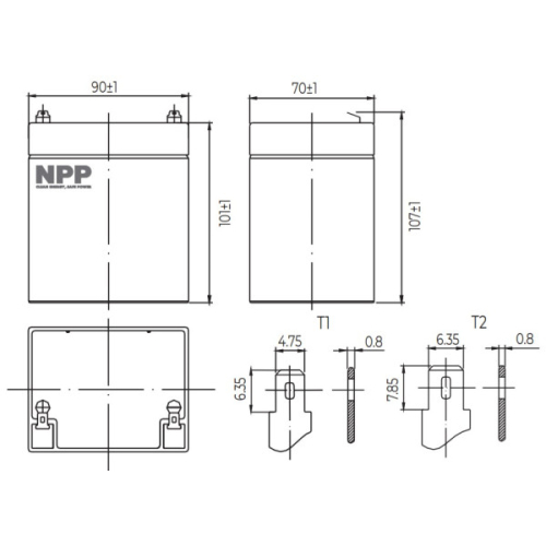 UPOZORENJE: iskljucivo upotrebiti za odgovarajuce uredaje!VRLA AGM baterije su namenjene za redovno pražnjenjei punjenje (potpuno pražnjenje može tranjno ošteti bateriju)Serija baterija opšte namene NPP Power dizajnirana je sa najsavremenijom AGM (upijajucom staklenom prostirkom) tehnologijom, plocama visokih performansi i elektrolitom. Sa odlicnom vrednošcu i karakteristikama, ovaj asortiman je pogodan za sve primene opšte namene.-Stabilan kvalitet i visoka pouzdanost-Dug radni vek-Rad bez održavanja-Rešetke za teške uslove rada-Nisko samopražnjenjePrimena za:Kontrolni sistemi/Elektricne igracke/Svetiljka za hitne slucajeve/Elektricni alati/Alarmni sistemi/Sistemi svetla za hitne slucajeve/Napajanje u stanju pripravnosti/UPS/Napajanje/Telekomunikacioni sistem/Rezervno napajanje protivpožarne opreme/Železnicki sistem/Elektronske stanice..Nominalni napon: 12V (6 celija po jedinici)Nominalni kapacitet pri brzini od: 20 sati/10,5V (25°C) : 4,5Ah10 sati/10,5V (25°C) : 4,2Ah5 sati/10,5V (25°C) : 3,85AhTip terminala: T1/T2Obrtni moment: N/APribl. unutrašnji otpor (25°C): 30,0 mODimenzije:Dužina: 90±1mm (3.54inch) Širina: 70±1mm (2.76inch)Visina: 101±1mm (3.98inch)Ukupna visina: 107±1mm (4.21inch)Design Life (stand-by): JIS na 25°C 5 godinaEurobat na 20°C 3-5 godinaTežina: 1,5 kg (3,31 lbs) ±4%Nominalna radna temperatura 25±3°C (77°F±5)Operativna temperatura: -Pražnjenje -15°C~50°C (5°F~122°F)-Punjenje -10°C~50°C (14°F~122°F)-Skladištenje -20°C~50°C (-4°F~122°F)Napon punjenja float na 25°C 13.6V~13.8VNapon ciklickog punjenja na 25°C 14,5V~15,0VTemperatura kompenzacija:-Plutajuce punjenje -18 mV/°C/blok-Ciklusno punjenje -30 mV/°C/blokMax. struja punjenja (A) 1.35AMax. struja pražnjenja za 5 sekundi 68AStopa samopražnjenja (25°C) =3%/mesecnoKontejner za baterije ABS UL94-HB V-0 opcionoPozitivna ploca: Olovni dioksidNegativna ploca: OlovoKontejner: ABS (V-0 opt.)Separator: AGMElektrolit: Sumporna kiselinaSigurnosni ventil: GumaTerminal: BakarGarancija: 1 godina