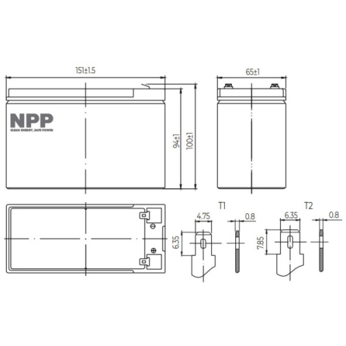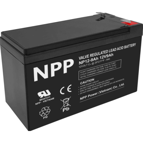 UPOZORENJE: iskljucivo upotrebiti za odgovarajuce uredaje!VRLA AGM baterije su namenjene za redovno pražnjenjei punjenje (potpuno pražnjenje može tranjno ošteti bateriju)Serija baterija opšte namene NPP Power dizajnirana je sa najsavremenijom AGM (upijajucom staklenom prostirkom) tehnologijom, plocama visokih performansi i elektrolitom. Sa odlicnom vrednošcu i karakteristikama, ovaj asortiman je pogodan za sve primene opšte namene.-Stabilan kvalitet i visoka pouzdanost-Dug radni vek-Rad bez održavanja-Rešetke za teške uslove rada-Nisko samopražnjenjePrimena za:Kontrolni sistemi/Elektricne igracke/Svetiljka za hitne slucajeve/Elektricni alati/Alarmni sistemi/Sistemi svetla za hitne slucajeve/Napajanje u stanju pripravnosti/UPS/Napajanje/Telekomunikacioni sistem/Rezervno napajanje protivpožarne opreme/Železnicki sistem/Elektronske stanice..Nominalni napon: 12V (6 celija po jedinici)Nominalni kapacitet pri brzini od: 20 sati/10,5V (25°C) : 9Ah10 sati/10,5V (25°C) : 8,4Ah5 sati/10,5V (25°C) : 7,7AhTip terminala: T1/T2Obrtni moment: N/APribl. unutrašnji otpor (25°C): 20 mODimenzije:Dužina: 151±1.5mm (5.94inch)Širina: 65±1mm (2.56inch)Visina: 94±1mm (3.70inch)Ukupna visina: 100±1mm (3.94inch)Design Life (stand-by): JIS na 25°C 5 godinaEurobat na 20°C 3-5 godinaTežina: 2,5 kg (4,85 lbs) ±4%Nominalna radna temperatura 25±3°C (77°F±5)Operativna temperatura: -Pražnjenje -15°C~50°C (5°F~122°F)-Punjenje -10°C~50°C (14°F~122°F)-Skladištenje -20°C~50°C (-4°F~122°F)Napon punjenja float na 25°C 13.6V~13.8VNapon ciklickog punjenja na 25°C 14,5V~15,0VTemperatura kompenzacija:-Plutajuce punjenje -18 mV/°C/blok-Ciklusno punjenje -30 mV/°C/blokMax. struja punjenja (A) 2.7AMax. struja pražnjenja za 5 sekundi 135AStopa samopražnjenja (25°C) =3%/mesecnoKontejner za baterije ABS UL94-HB V-0 opcionoPozitivna ploca: Olovni dioksidNegativna ploca: OlovoKontejner: ABS (V-0 opt.)Separator: AGMElektrolit: Sumporna kiselinaSigurnosni ventil: GumaTerminal: Bakar