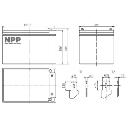 UPOZORENJE: iskljucivo upotrebiti za odgovarajuce uredaje!VRLA AGM baterije su namenjene za redovno pražnjenjei punjenje (potpuno pražnjenje može tranjno ošteti bateriju)Serija baterija opšte namene NPP Power dizajnirana je sa najsavremenijom AGM (upijajucom staklenom prostirkom) tehnologijom, plocama visokih performansi i elektrolitom. Sa odlicnom vrednošcu i karakteristikama, ovaj asortiman je pogodan za sve primene opšte namene.-Stabilan kvalitet i visoka pouzdanost-Dug radni vek-Rad bez održavanja-Rešetke za teške uslove rada-Nisko samopražnjenjePrimena za:Kontrolni sistemi/Elektricne igracke/Svetiljka za hitne slucajeve/Elektricni alati/Alarmni sistemi/Sistemi svetla za hitne slucajeve/Napajanje u stanju pripravnosti/UPS/Napajanje/Telekomunikacioni sistem/Rezervno napajanje protivpožarne opreme/Železnicki sistem/Elektronske stanice..Nominalni napon: 12V (6 celija po jedinici)Nominalni kapacitet pri brzini od: 20 sati/10,5V (25°C) : 12Ah10 sati/10,5V (25°C) : 11,2Ah5 sati/10,5V (25°C) : 10,25AhTip terminala: T1/T2Obrtni moment: N/APribl. unutrašnji otpor (25°C): 19,0 mODimenzije:Dužina: 151±1,5 mm (5,94 inca)Širina: 98±1 mm (3,86 inca)Visina: 95±1 mm (3,74 inca)Ukupna visina: 101±1 mm (3,98 inca)Design Life (stand-by): JIS na 25°C 5 godinaEurobat na 20°C 3-5 godinaTežina: 3,40 kg (7,51 lbs) ±4%Nominalna radna temperatura 25±3°C (77°F±5)Operativna temperatura: -Pražnjenje -15°C~50°C (5°F~122°F)-Punjenje -10°C~50°C (14°F~122°F)-Skladištenje -20°C~50°C (-4°F~122°F)Napon punjenja float na 25°C 13.6V~13.8VNapon ciklickog punjenja na 25°C 14,5V~15,0VTemperatura kompenzacija:-Plutajuce punjenje -18 mV/°C/blok-Ciklusno punjenje -30 mV/°C/blokMax. struja punjenja (A) 3.6AMax. struja pražnjenja za 5 sekundi 180AStopa samopražnjenja (25°C) =3%/mesecnoKontejner za baterije ABS UL94-HB V-0 opcionoPozitivna ploca: Olovni dioksidNegativna ploca: OlovoKontejner: ABS (V-0 opt.)Separator: AGMElektrolit: Sumporna kiselinaSigurnosni ventil: GumaTerminal: BakarGarancija: 1 godina