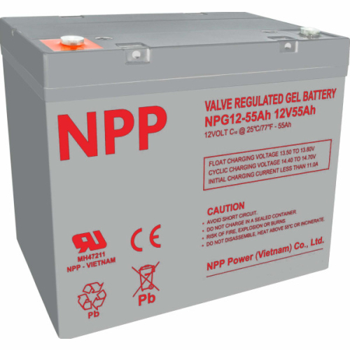 UPOZORENJE: iskljucivo upotrebiti za odgovarajuce uredaje!VRLA GEL baterije su namenjene za redovno pražnjenje i punjenje (potpuno pražnjenje može tranjno ošteti bateriju)NPP Power AGM GEL (DEEP CYCLE) serija se proizvodi u skladu sa najvišim zahtevima u dubokom ciklusu i aplikacijama obnovljive energije. Baterije koriste koloidni ili penasti silika gel za imobilizaciju elektrolita, što dodatno poboljšava stabilnost ciklusa. Dostupan u gornjim i prednjim tipovima terminala.-Duži vek trajanja-Visoka pouzdanost i kvalitet-Dobra sposobnost ciklusa dubokog pražnjenja-Odlican oporavak od dubokog pražnjenjaPrimena za:Napajanje u stanju pripravnosti/UPS/Telekomunikacioni sistem/Solarni sistem/Vetrosistem/Elektrane.Nominalni napon: 12V (6 celija po jedinici)Nominalni kapacitet pri brzini od:20 sati/10,5V (25°C) : 55Ah10 sati/10,5V (25°C) : 58,4Ah5 sati/10,5V (25°C) : 43,35AhTip terminala: T14Obrtni moment: 5,1±0,6NmPribl. unutrašnji otpor (25°C): 7mODimenzije:Dužina: 230±2mm (9.06inch)Širina: 138±2mm (5.43inch)Visina: 211±2mm (8.31inch)Ukupna visina: 215±2mm (8.46inch)Design Life (stand-by): JIS na 25°C 12 godinaEurobat na 20°C 10/12 godinaTežina: 17,3kg ±3%Nominalna radna temperatura 25±3°C (77°F±5)Operativna temperatura:-Pražnjenje -15°C~50°C (5°F~122°F)-Punjenje -10°C~50°C (14°F~122°F)-Skladištenje -20°C~50°C (-4°F~122°F)Napon punjenja float na 25°C 13.5V~13.8VNapon ciklickog punjenja na 25°C 14,5V~14,7VTemperatura kompenzacija:-Plutajuce punjenje -18 mV/°C/blok-Ciklusno punjenje -30 mV/°C/blokMax. struja punjenja (A) 11AMax. struja pražnjenja za 5 sekundi 500AStopa samopražnjenja (25°C) =3%/mesecnoKontejner za baterije ABS UL94-HB V-0 opcionoPozitivna ploca: Olovni dioksidNegativna ploca: OlovoKontejner: ABS (V-0 opt.)Separator: AGMElektrolit: Gel sumporne kiselineSigurnosni ventil: GumaTerminal: BakarGarancija: 1 godina