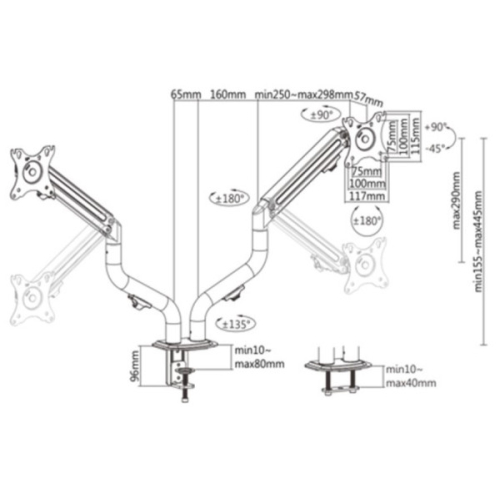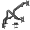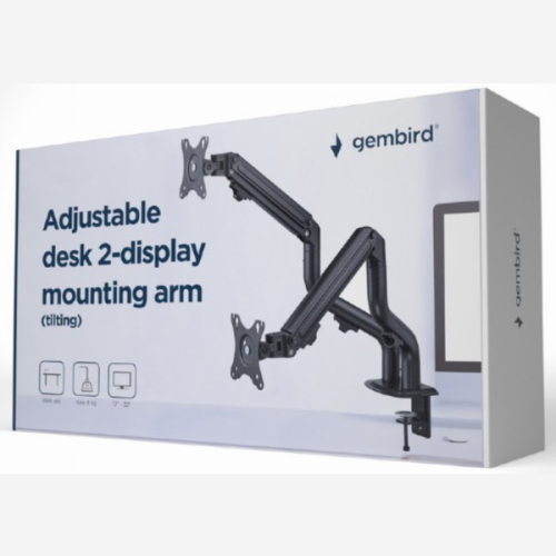 Podesiva ruka za montažu sa 2 ekrana (nagib), 17”-32”, do 8 kgPostavite ekran savršeno-Montaža za sto za monitor sa duplim nosacima monitora-Ruke se rotiraju, izvlace i uvlace, naginju da bi se promenili uglovi citanja i omogucavaju rotiranje ekrana iz režima pejzažnog u portret, itd.-Omogucava lako ergonomsko pozicioniranje za smanjeno opterecenje-Radi sa skoro svim LCD monitorima (max. 32")-Izdržljive podesive gasne opruge pogodne za monitore od 2 - 8 kg-Snažna stezaljka za radni sto ili otvor za lako i sigurno pricvršcivanje na vaš sto-Ugradeno upravljanje kablovima za organizovan i uredan radni prostor-VESA kompatibilan (100x100mm i 75x75mm)Materijal: celik, aluminijum, plastikaPovršinska obrada: praškasti premazBoja: crna fine tekstureOdgovara velicini ekrana: 17" - 32"Kapacitet težine (po ekranu): 2 ~ 8 kgVesa kompatibilan: 75x75, 100x100 mmOpseg nagiba: +90° ~ -45°Opseg okretanja: +90° ~ -90°Rotacija ekrana: +180° ~ -180°Montaža: stezaljka, cauraPreporucena debljina radne površine: stezaljka: 10 ~ 80 mm, otvor: 10 ~ 40 mmUpravljanje kablovima: daNeto težina: 3,8 kg