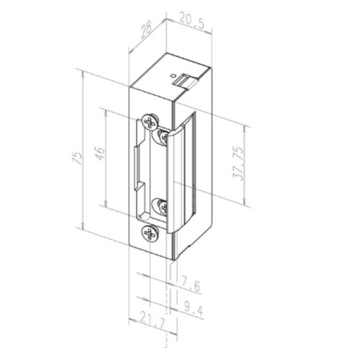 Univerzalni - bez određenog pravca otvaranja.• Podesivi jezik sa pomeranjem 3 mm.• Napon napajanja: 8-16V AC/DC• Kompatibilan sa 12V interfon sistemom• Univerzalni bez memorije i bloka.• NC kontakt (fail secure): ostaje zaključan u odsustvu napona.• Uložna ploča od čelika obrađenog cinkomTehnički podaciNapon 8-16 V AC/DC8-16 V AC/DCDIN smer UniversalUniversalPodesiva brava (FF, FaFik®) Da DaMehaničko otključavanje (E) Da DaZaključano na grešku Da DaFunkcija držanja otvorenog Da DaOtpor protiv provale 3500 N3500 NVisina 75 mm75 mmŠirina 20,5 mm20,5 mmDubina 28 mm28 mmOpseg radne temperature -15 °C do +40 °C-15 °C do +40 °COpseg tolerancije radnog napona 8 V *Nicht Ubersetzt: vieas specificiranoOpseg tolerancije nominalnog radnog napona kako je specificiranoOpseg tolerancije radnog napona 12 V *Nicht Ubersetzt: vieas specificiranoOpseg tolerancije radnog napona 16 V *Nicht Ubersetzt: vieas specificiranoNazivni otpor 8 V 22 O22 ONominalni otpor 12 V 22 O22 ONazivni otpor 16 V 22 O22 OPotrošnja naizmenične struje 8 V 310 mA310 mAPotrošnja naizmenične struje 12 V 470 mA470 mAPotrošnja naizmenične struje 16 V 620 mA620 mAPotrošnja jednosmerne struje (50% preostalo talasanje) 8 V 350 mA350 mAPotrošnja jednosmerne struje (50% rezidualnog talasa) 12 V 520 mA520 mAPotrošnja jednosmerne struje (50% zaostalih talasa) 16 V 690 mm690 mmPotrošnja jednosmerne struje (stabilizovana) 8 V 360 mA360 mAPotrošnja jednosmerne struje (stabilizovana) 12 V 550 mA550 mAPotrošnja jednosmerne struje (stabilizovana) 16 V 730 mA730 mAMaks. brava predopterec´enja AC rad 8 V 60 N60 NMaks. brava predopterec´enja AC rad 12 V 150 N150 NMaks. brava predopterec´enje AC rad 16 V 150 N150 NMaks. zadržati predopterec´enje DC (50% preostalo talasanje) 8 V 80 N80 NMaks. predopterec´enje reze DC (50% talasanja) 12 V 50 N50 NMaks. predopterec´enje reze DC (50% talasanja) 16 V 50 N50 NMaks. predopterec´enje reze DC (stabilizovano) 8 V 50 N50 NMaks. predopterec´enje reze DC (stabilizovano) 12 V 10 N10 NMaks. predopterec´enje reze DC (stabilizovano) 16 V 10 N10