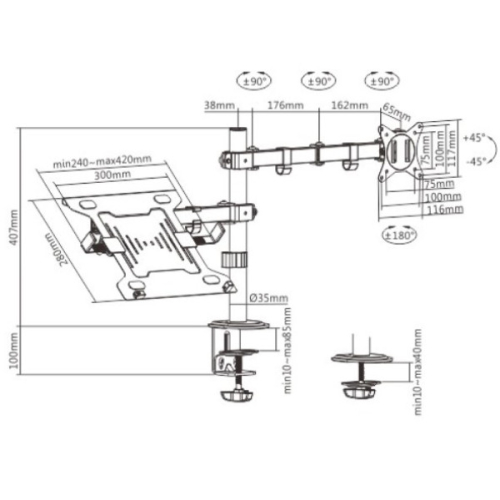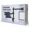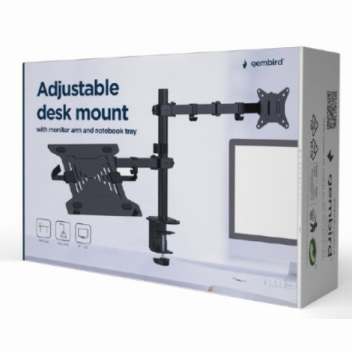 Savršeno postavite ekran da biste smanjili naprezanje vrata i ociju.-Povecajte svoju produktivnost korišcenjem prednosti podešavanja dvostrukog ekrana-Nosac za sto sa rukom za monitor i postoljem za notebook-Podržava monitore do 32" i notebook racunare do 15,6"-Ruka se rotira (+180° ... -180°), naginje (+/-45°) da bi promenila uglove citanja i omogucava rotaciju ekrana iz režima pejzažnog u portret, itd.Radi sa skoro svim LCD monitorima (max. 32").VESA kompatibilan (100 x 100 mm i 75 x 75 mm).Podesiva metalna ladica sa otvorima za ventilaciju za notebook.Snažna stezaljka za radni sto ili otvor za lako i sigurno pricvršcivanje na vaš sto.Ugradeno upravljanje kablovima za organizovan i uredan radni prostor.Materijal: celik, plastikaPovršinska obrada: praškasti premazBoja: crna fine tekstureOdgovara velicini ekrana: 17" - 32"Kapacitet težine (po ruci): 9 kgVesa kompatibilan: 100x100, 75x75 mmOpseg nagiba: +45° ~ -45°Opseg okretanja: +90° ~ -90°Rotacija ekrana: +180° ~ -180°Montaža: spojnica, stezaljkaPreporucena debljina radne površine: stezaljka: 10 ~ 85 mm, otvor: 10 ~ 40 mmUpravljanje kablovima: daNeto težina: 4,7 kg