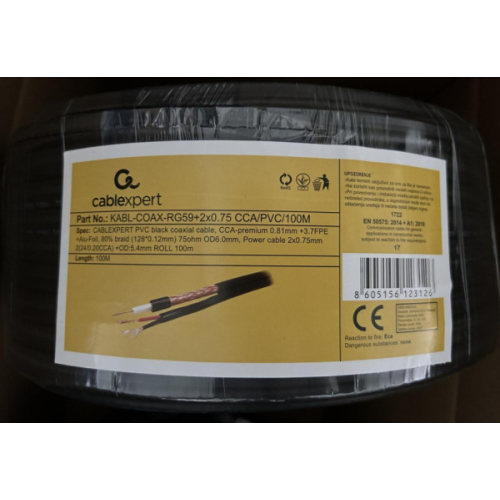 CCTV CABLE WITH POWER CABLE RG59+2X0.75MM2 PVC BLACK 100M/ROLLSPEC:0.81MM CCA+3.70FPE+ COPPER COLORALUMINUM FOIL+80% CCA BRAIDS( 128*0.12MM) +OD:6.0MM + 2X0.75MM2(24/0.20CCA)+OD:5.4MMKABL-COAX-RG59+2X0.75 CCA/PVC/100M CABLEXPERT INDOOR RG59 COAX CABLE WITH POWER CABLE 75 OHM 001M……100MPVC Kabl za video nadzorProizvodac: CABLEXPERTDužina kabla: 100m sa 2*0,75mmTip: RG59+2x0,75mmMaterijal jezgra: CCA - pun presekPrecnik jezgra: 0.81 mmPletenica: 80% 128*0,12mm CCASpoljni oklop: PVC 6mmBoja: CrnaNapojni kabel: Da - licnasti 2 x 0.75 mm2 CCABoja: Crveni i crni napojni kabl u crnom oklopuMaterijal spoljnog omotaca: PVC - crnaDimenzije: 6mm1.Cond.(1) Resistance: 20C, Conductor DC Resistance: <50.50O/100M 2.Cond.(2) Resistance: 20C, Conductor DC Resistance: <20.00O/100M 3.Rated Volage: 80v 4.Rated Temperature: 80 5.Impedance(O) 200MHZ: 75±5O 6.Capacitance(pF/m): 67(+/-5) NAPOMENA:-Kabl koristiti iskljucivo za ono za šta je namenjen.-Ne koristiti kao provodnik visokih napona ili slicno.-Pri povezivanju i instalaciji mreže, obratiti pažnju na redosled provodnika, u suprotnom može doci do oštecenja uredaja ili necete dobiti željeni signal.