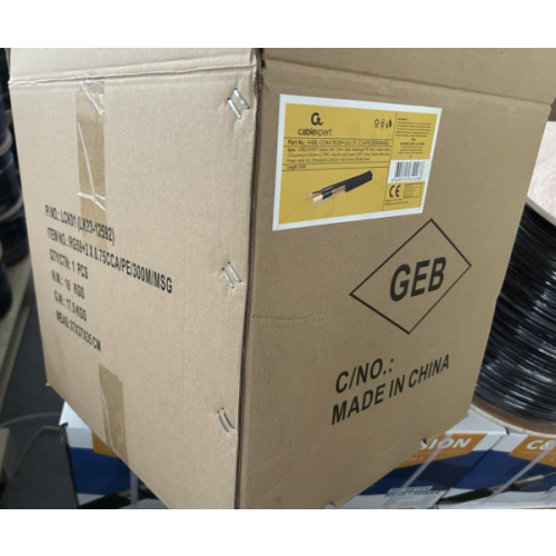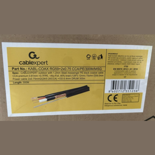 CCTV CABLE WITH POWER CABLE WITH 1.2MM STEEL MESSENGERRG59+2X0.75MM2 PE WITH 1.2MM STEEL MESSENGER BLACK 300M/WOODENDRUM SPEC:0.81MM CCA+3.70FPE+ COPPER COLOR ALUMINUM FOIL+80% CCA BRAIDS( 128*0.12MM) +OD:6.0MM PE + 2X0.75MM2(24/0.20CCA)+OD:5.4MM PE+1.2MM STEEL MESSENGER PE KABLCOAX-RG59+2X0.75 CCA/PE/300M/MSG CABLEXPERT OUTDOOR RG59 COAX CABLE WITH POWER CABLE & MESSENGER 75 OHM 001M……300MPE Kabl za video nadzor za spoljnu upotrebu sa sajlomProizvodac: CABLEXPERTTest Standard: UL1581,UL444 Dužina kabla: 300m sa 2*0,75mmDrveni koturTip: RG59+2x0,75mmMaterijal jezgra: CCA - pun presekPrecnik jezgra: 0.81 mmPletenica: 80% 128*0,12mm CCASpoljni oklop: PE 6mmBoja: CrnaNapojni kabel: Da - licnasti 2 x 0.75 mm2 CCABoja: Crveni i crni napojni kabl u crnom oklopuSajla:1,2mm celicna (PE)Precnik: 5,4mm 1.Cond.(1) Resistance: 20C, Conductor DC Resistance: <50.50O/100M 2.Cond.(2) Resistance: 20C, Conductor DC Resistance: <20.00O/100M 3.Rated Volage: 80v 4.Rated Temperature: 80C 5.Impedance(O) 200MHZ: 75±5O 6.Capacitance(pF/m): 67(+/-5) NAPOMENA:-Kabl koristiti iskljucivo za ono za šta je namenjen.-Ne koristiti kao provodnik visokih napona ili slicno.-Pri povezivanju i instalaciji mreže, obratiti pažnju na redosled provodnika, u suprotnom može doci do oštecenja uredaja ili necete dobiti željeni signal.