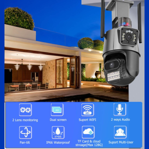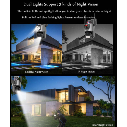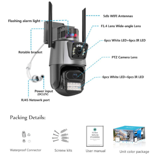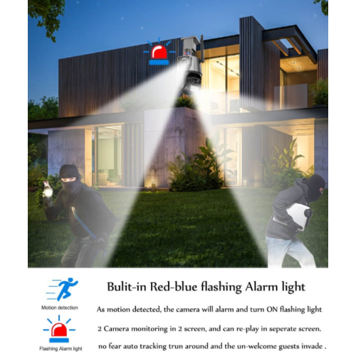 Model: CAM-IP6MP-EP11-QQ6MP H.265 WiFi Camera, 4.5 Inch, ICSEE App9pcs IR LED + 8pcs White LEDTwo Lens: 3.6mm + 3.6mm Lens, Alarm SirenRJ45, Onvif P2P, Smart Human DetectionIP66, Two Way Audio, 2A Adapter, Support TF CardSmart IR&Color Night Vision, Pan 355°, Tilt 90°Prepoznavanje ljudi, AI alarm, WIFI sferna, IP kamera Karakteristike: 3 MP bullet kamera i 3 MP PTZ kamera, slika je spojena gore-dolePodržava AI detekciju ljudi, automatsko pracenje i snimanje.Podržava dvostruko svetlo, ljudski oblik i inteligenciju (mešanje linija, briga o području, itd.).Podržava žičnu i bežičnu mrežnu vezu.Napredna tehnologija video kompresije H.265AI, ultra-niska brzina prenosa, kvalitet slike visoke definicije.Zaštita od groma, u skladu sa nacionalnim standardom GB/T17626.5 i međunarodnim standardom IEC61000-4-5.Podržava ONVIF protokol i pristup pozadini/platformi trece strane.Podržava pracenje mobilnih telefona (iOS, android).Model: Bulet kamera + PTZ kamera Glavna kontrola: Dvojezgarni 32-bitni DSP (XM650V200), čista tvrda kompresija.Senzor: 300AI, 6MP 1/2.8 "SC233A CMOS senzori visokih performansi Minimalno osvetljenje: "Boja: 0.01Lux @(F1.2,AGC ON); 0 Lux sa IR;Crno-belo: 0,001 Lux @ (F1.2, AGC ON), 0 Lux sa IR" Shutter: 1/50(1/60)s -1/10000s Ocal distance: F1.4*3.6MM+F1.4* 3.6MM Smanjenje šuma: Podržava 2D/3D smanjenje šuma Video format: H.265AI Glavna rezolucija: 2304*2592 ; Podrezolucija: 800 * 896 Brzina kadrova: 12 fps Inteligentna analiza: Podržava AI detekciju ljudskog oblika Funkcija prac´enja: Podržava pracenje ljudskog oblika Izvor svetlosti: 11 infracrveno+12 belo svetlo Svetlosni režim: Starlight pune boje/infracrveni nocni vid/dvostruko svetlo upozorenje Dvosmerna glasovna podrška Podrška za skladištenje u oblaku Podrška za NETIP protokol i onvif protokol Mrežni interfejs: 10M/100M adaptivni Ethernet port Interfejs za skladištenje: Lokalna TF kartica (do 256GB) Bežični standard IEEE802.11b, 802.11g, 802.11n Frekvencijski opseg: 2,4 GHz ~ 2,4835 GHz Snaga: 10W Veličina proizvoda: 223,87*120,26*130,15 mm Veličina kutije u boji: 230*225*147mm Temperatura: -10 ° C -60 ° C, vlažnost manja od 90% (bez kondenzacije) Napajanje: DC 12V ± 10%