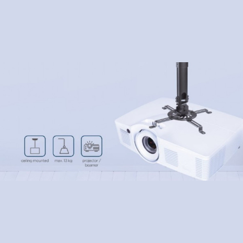 Okačite svoj bimer na plafon za optimalno iskustvo gledanjaUniverzalni dizajn: pogodan za upotrebu sa vecinom beamera/projektora-Podesivi nosač za plafonski projektor-Montaža za potpuni pokret sa podešavanjem visine i funkcijom nagiba / okretanja / rotiranja-Podržava vecinu projektora/bimera (max. 13 kg)-Uključuje sve potrebne materijale za ugradnjuMaterijal: čelikPovršinska obrada: praškasti premazBoja: CrnaKapacitet težine: 13 kgŠirina ugradnje projektora: 54 ~ 320 mmOpseg nagiba: +15 ° ~ -15 °Opseg okretanja: +15 ° ~ -15 °Rotacija: 360 °Podešavanje visine: 380 ~ 580 mmNeto težina: 1,16 kgDimenzije: 334 x 334 x 580 mm