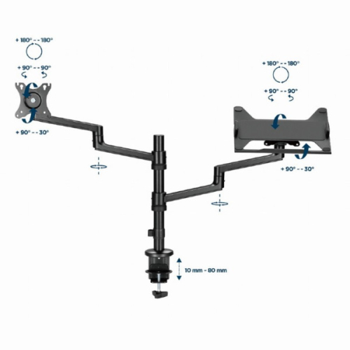 Podesiva ruka monitora postavljena na sto sa ležištem za notebookSavršeno postavite ekran da biste smanjili naprezanje vrata i očijuPovecajte svoju produktivnost korišcenjem prednosti podešavanja dvostrukog ekrana- Nosač za monitor koji se montira na sto sa ležištem za notebook- Ruke se rotiraju, izvlače i uvlače, naginju da bi se promenili uglovi čitanja i omogucavaju rotiranje ekrana iz pejzažnog u portretni režim itd.- Omogucava lako ergonomsko pozicioniranje za smanjeno opterecenje- Radi sa skoro svim LCD monitorima (maks. 32") i podržava prenosne računare do 17,3"- VESA kompatibilan (100 x 100 mm i 75 x 75 mm)- Snažna stezaljka za radni sto ili otvor za lako i sigurno pričvršcivanje na vaš sto- Ugrađeno upravljanje kablovima za organizovan i uredan radni prostoMaterijal: aluminijum, čelik, plastikaPovršinska obrada: praškasti premazBoja: CrnaPrilagodite veličinu ekrana: 17" ~ 32"Kapacitet težine: 8 kg (po ruci)VESA kompatibilan: 75 x 75, 100 x 100 mmOpseg nagiba: +90 ° ~ -30 °Opseg okretanja: +90 ° ~ -90 °Rotacija ekrana: +180 ° ~ -180 °Instalacija: Stezaljka za sto ili otvorMaks. Debljina stola: Stezaljka: 10 ~ 80 mm, Uložak: 10 ~ 40 mmUpravljanje kablovima: DaNeto težina: 4,62 kgDimenzije: 117 x 300 x 800 mm