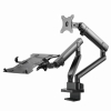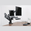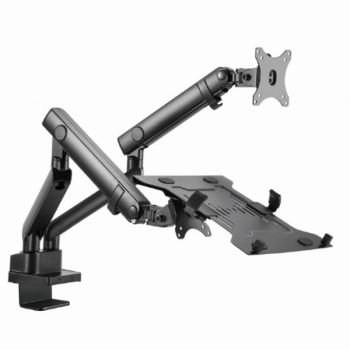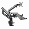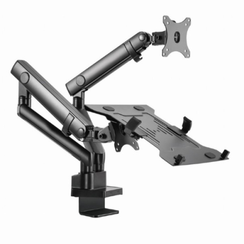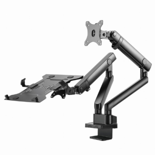Postavite ekran savršenoLagani dizajn u punom pokretuNosač za monitor koji se montira na sto sa ležištem za notebook.Ruke se rotiraju, izvlače i uvlače, naginju da bi se promenili uglovi čitanja i omogucavaju rotiranje ekrana iz režima pejzažnog u portret, itd.Omogucava lako ergonomsko pozicioniranje za smanjeno opterecenjeRadi sa skoro svim LCD monitorima (max. 32") i podržava prenosne računare do 15,6"Izdržljive podesive ruke sa oprugom, pogodne za monitore od 1 - 8 kgSnažna stezaljka za radni sto ili otvor za lako i sigurno pričvršcivanje na vašem stoluVESA kompatibilan (100x100mm i 75x75mm)Materijal: aluminijum, čelik, plastikaPovršinska obrada: praškasti premazBoja: crnaMax. veličina ekrana: 17" - 32"Kapacitet težine: 1 ~ 8 kg (po ruci)VESA kompatibilan: 75x75, 100x100mmOpseg nagiba: +90 ° ~ -90 °Opseg okretanja: +90 ° ~ -90 °Rotacija ekrana: +90 ° ~ -90 °Instalacija: Stezaljka za sto ili otvorMax. Debljina stola: Stezaljka: 10 ~ 85 mm, Uložak: 10 ~ 40 mmUpravljanje kablovima: DaNeto težina: 6,23kgDimenzije: 1137x346x530mm