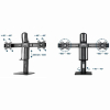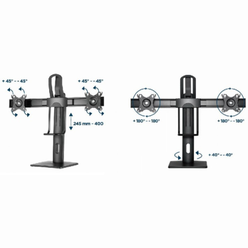 Postavite svoje ekrane savrseno za optimalan ergonomski polozajKompaktno resenje za ustedu prostora-Stoni stalak podesiv po visini za dva monitora-Lako podesavanje visine izmedu 245 - 400 mm-Omogucava okretanje i naginjanje vasih ekrana i omogucava rotiranje ekrana iz pejzaznog u portretni rezim-Radi sa skoro svim LCD monitorima (max. 27" / 6 kg)-Stabilna osnovna ploca za sigurno postavljanje na bilo koji sto-Ugradeno upravljanje kablovima za organizovan i uredan radni prostor-VESA kompatibilan (100 x 100 mm i 75 x 75 mm)Materijal: aluminijum, celik, plastikaPovrsinska obrada: praskasti premazBoja CrnaOdgovara velicini ekrana: 17" - 27"Kapacitet tezine: 2 ~ 6 kg (po displeju)VESA kompatibilan: 75 x 75, 100 x 100 mmPodesavanje visine: 245 ~ 400 mmOpseg nagiba: +45 ° ~ -45 °Opseg okretanja: +40 ° ~ -40 °Rotacija ekrana: +180 ° ~ -180 °Neto tezina: 4,6 kgDimenzije: 737 x 200 x 570 mm