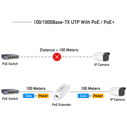 Power over Ethernet Extender, Model: POE10Kompatibilan sa IEEE802.3af i IEEE802.3at,Proširuje domet PoE i Ethernet-a za dodatnih 100 metara,Nije potrebno dodatno napajanje,Automatski otkriva i štiti PoE opremu od postojanja oštećeni pogrešnom instalacijom,Mreža pune brzine na celoj produženoj udaljenosti,Kompaktna veličina, dizajn za montažu na zid,Jednostavna plug-and-play instalacija,EMI standardi su u skladu sa FCC, CE klasom BNaziv proizvoda: POE10Broj kanala: 1Brzina prolaza podataka: 10/100/1000 Mbps polu/pun dupleksUlaz za napajanje preko Etherneta: Dodela pinova i polaritet: I 1/2 (-), 3/6 (+) i 7/8 (-), 4/5 (+)Napajanje preko Etherneta: Dodela pinova i polaritet: 1/2 (+), 3/6 (-) Izlazna snaga: do 25 WIndikatori: LED indikatori se nalaze na RJ45 konektoru Indikator napajanja: PoE omogućen Mrežni indikator: Link/ActKonektori: oklopljeni RJ-45, EIA 568A i 568BMrežni kablovi: zaštićena kategorija 5 (ili viša)Dimenzije: 145 mm x 60 mm x 40 mmMontaža: zid policeOkruženje: unutra ili na otvorenomUslovi životne sredine:• Radna temperatura okoline: -10 do 45 C, Radna vlažnost: maksimalno 90%, bez kondenzacije,• Temperatura skladištenja: -20 do 60 C• Vlažnost skladišta: Maksimalno 95%, bez kondenzacijeUsklađenost sa propisima: IEEE 802.3af (PoE), IEEE 802.3at (PoE+)