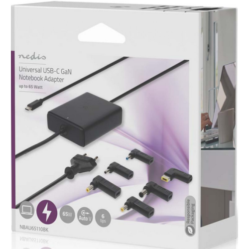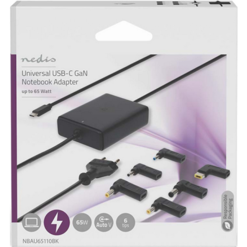 • Univerzalni punjač 65V za notebook računare sa USB-C konektorom i podrškom za napajanje• Uvek obezbeđuje tačnu količinu energije za vaš prenosni računar, pametni telefon ili tablet• Isporučuje se sa 6 DC napona za najpopularnije brendove laptopova• 5 namenskih PD (isporuka energije) profila• Idealan kao drugo napajanje za kucnu kancelariju, mobilni rad ili na poslovnom putu• Ultra-kompaktan i lagan dizajn - lako se nosi sa sobom• Međunarodni nivo efikasnosti VI• Automatski izbor napona• Bezbedan za upotrebu zahvaljujuci zaštiti od pregrevanja i prenaponskoj zaštiti• Ekstra dugačak kabl od 2,5 metaraŠirina: 82 mmVisina: 25 mmDubina: 50 mmTežina: 292 gBoja: crnaUlazni napon: 100 - 240 V AC 50/60 HzTip izvora napajanja: Mrežno napajanjeDužina kabla za napajanje: 1,50 mKabl za napajanje A: Euro / Tip C (CEE 7/16)Materijal: PolikarbonatKabl za napajanje na strani B: USB-C™Utikač za napajanje: Euro / Tipe-C (CEE 7/16)Tip punjača Notebook; univerzalanOdvojivi DC kabl: neIzlazna snaga: 65 wKoristi se za: Notebook;Smartphone;TabletBroj proizvoda u pakovanju: 1 komIzlazna struja 2,4 A; 3,0 A; 3,25 AIzlazni napon: 12 V DC;9 V DC;5 V DC;15 V DC;20 V DCGaN: DaSmartLife: neDužina kabla adaptera za napajanje: 2,50 mSa centrom: neTip izlaznog priključka: USB-C™Nedis 65 V univerzalni GaN adapter za prenosni računar je savršen pratilac za vaš notebook ili netbook. Sa ovim adapterom USB Tipe-C™ kabl se može koristiti za punjenje laptopa. Ugao od 90° izbegava savijanje kabla i zbog malih dimenzija, adapter je idealan saputnik u pokretu.Adapter je 100% kompatibilan sa onim koji je originalno isporučen uz notebook. Vaš laptop je uvek napunjen pravom količinom energije zahvaljujuci unapred definisanim profilima za isporuku energije. Punjač komunicira sa vašim laptopom kako bi izabrao najefikasniji profil punjenja. Ovo omogucava korišcenje adaptera i za punjenje pametnog telefona ili tableta sa USB-C vezom.Ovaj adapter za prenosni računar radi sa tehnologijom galijum nitrida (GaN), koja je efikasnija, manja, lakša i troši manje energije od tradicionalnih silikonskih punjača.Isporučuje se sa 6 adaptera za napajanje za USB Tipe-C kabl za punjenje prenosnog računaraTip B: 5,5 k 1,7 mm - Toshiba, Acer, itdTip E: 4,5 k 3,00 mm - HP, itdTip F: 4,0 k 1,35 mm - Asus, itdTip L: 5,5 k 2,5 mm - HP, IBM, Dell, CompakTip K: 7,4 k 5,0 mm - HPTip U: kvadrat 11,0 k 4,6 mm - Lenovo, IBM