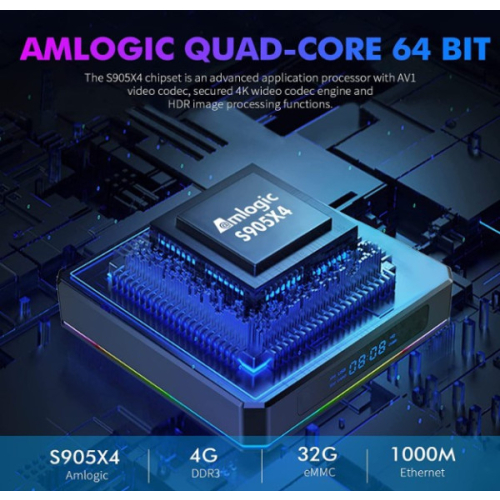 Android 11.0 OS i mocan S905x4 cipsetX96 X4 android TV BOX ima najnoviji android 11.0 OS i pokrec´e jaci S905X4 cetvorojezgarni 64-bitni Cortex-A55, koji je stabilniji i brži, brzina procesa je veca od prethodne verzije. Android 11 tv box ima savršene performanse u ucitavanju softvera, igranju igrica i samom korišcenju.Dual WiFi 2.4G/5GHz & 1000M EthernetAndroid TV BOX 11.0 podržava 2.4/5GHZ Dual-WIFI i 10/100 Mbps Ethernet LAN, pružajuci stabilniji, super-brzi i jaci WiFi signal za strimovanje slike visokog kvaliteta, smanjujuci zamrzavanje i buffer. BT 4.2 pruža pogodnost za povezivanje bežicnih uredaja, cineci vaš život pametnijim.4GB RAM 64GB ROM & USB 3.0TV BOX dolazi sa 4GB RAM 64GB ROM memorije koji ima dovoljno prostora za pokretanje aplikacija i ucitavanje video zapisa. Takode možete proširiti prostor za skladištenje putem dodatnog cvrstog diska, mikro SD kartice ili eksternog USB uredaja (do 128GB), ne brinite o smrzavanju ili zujanju zbog nedostatka memorije. USB 3.0 ima prednost velike brzine prenosa.3D 8K HDR & AV1 dekodiranjePodržava 8K Ultra HD rezoluciju i novu tehnologiju dekodiranja AV1 (AV1 je 30% bolji od H.265 ili VP9), striming slike je glatkiji i jasniji. 3D dinamika donosi realisticne vizuelne efekte. Novi savremeni dizajn sa osvetljenjemX96 X4 android tv box sadrži svetla ciji LED efekat se može ukljuciti i iskljuciti, možete podesiti razlicite režime u skladu sa vašim raspoloženjem, uciniti vaš život šarenim.TV Box X96 X4Android 11,0Procesor Amlogic S905X4RAM: 4GBROM 64GBHardverske karakteristike boxa TV Box X96 X4:CPU – Amlogic S905X4 2.0GHz 64-bitGPU – ARM Mali-G31MP2RAM – 4GB DDR3ROM – 64GB eMMcWifi – IEEE 802.11 a/b/g/n/ac ; 2.4G +5.8G WIFILAN – 1000MbpsBluetooth – 4.2Dostupni portovi na boxu X96 X4:HDMI HDTV 2.1 ,Support HDTV CEC, Dynamic HDR and and 8Kx4K - 1xUSB 2.0 - 1xUSB 3.0 - 1xLAN 100Mbps 10/100M/1000M - 1xAV 480i/576i izlaz - 1xSD Card podrzane 4GB/8GB/16GB/32GB/64GB/128GB - 1xSPDIF Optical Audio - 1x