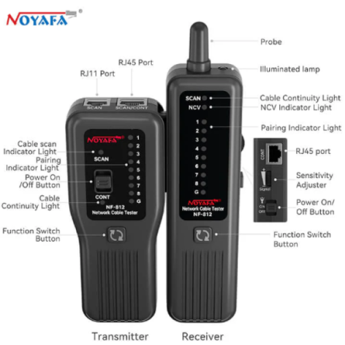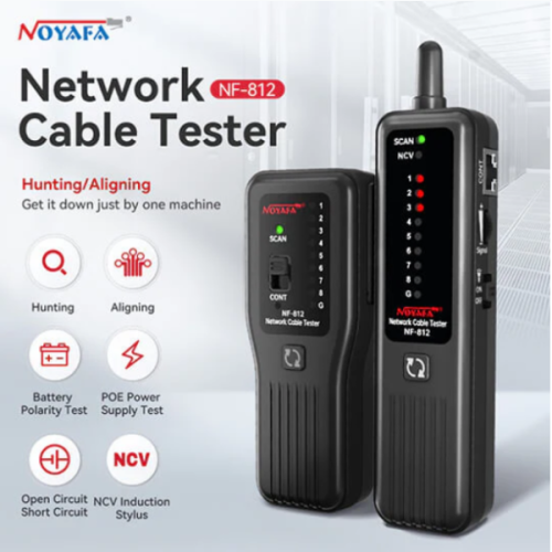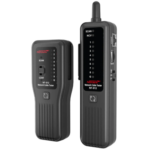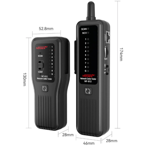 -RJ45 i RJ11 tester: Pokrenite test kontinuiteta za CAT5 i CAT6 kablove i telefonske linije da biste pronašli kratke spojeve, prekide, prekide i ukrštanje.-Mrežni toner: Povežite jedan kraj kabla sa uređajem Emitter. Koristite sondu za toner da pronađete drugi kraj kabla čak i ako je povezan na Ethernet prekidač. Takođe pomaže upariti zidni Ethernet port sa ciljnim portom na ruteru.-Tester kola: Pričvrstite aligatorske spone na bakarni deo strujnog kola. Identifikujte kratak ili otvoreni krug u jednoj sekundi.-Zaštita od napona: Podržava testiranje kablova ili žica sa napajanjem do 100V.-Provera PoE napajanja: Povežite Ethernet prekidač na NF-812 pomoću RJ45 kabla. Pokrenite PoE test da kažete žice koje obezbeđuju napajanje.-Test polariteta: Pričvrstite da biste identifikovali pozitivne i negativne krajeve baterije.Model br. NF-812Skeniranje kablova: Digitalno skeniranje kablovaTest kontinuiteta kabla: brzo/sporoPoE test: daIndikator snage: daPredajnik:Testiranje otvorenog/kratkog spoja: indikator praćenja skeniranja nije upaljen/Upaljeno crveno svetloTestiranje polariteta baterije: DC 3~60V.Napajanje: DC 9V (ekskluzivno)Struja isključivanja: ?10uAMaksimalna radna struja: ?20mAVeličina predajnika: 130k52.8k28mmPrijemnik:NCV: daLED osvetljenje: daNapajanje: DC 9V (ekskluzivno)Struja isključivanja: ?10uAMaksimalna radna struja: ?150mAVeličina prijemnika: 174×46×28 mm