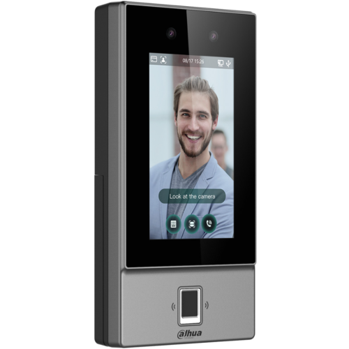 -Terminal/WiFi i mrežni kontroler za kontrolu pristupa sa Full HD DWDR kamerom za prepoznavanje lica, mifare čitačem, senzorom za otisak prsta i virtuelnom tastaturom-4.3" kapacitivni ekran osetljiv na dodir (rezolucija 480x272)-2MP CMOS dual-lens kamera, DWDR, sa IC svetlom-Preciznost prepoznavanja 99.9%-Brzina prepoznavanja 0.2s-Visina/Udaljenost detekcije lica 1.1-2.0m/0.3-1.5m-Verifikacija otiska prsta 1:N-Udaljenost očitavanja kartice 0 cm–3 cm-Podržava do 6.000 korisnika, 10.000 kartica, 6.000 šablona lica i 6.000 šifri, 6,000 otisaka prstiju-Memorija 300.000 događaja-Do 128 vremenskih rasporeda-Podrška za detekciju maske na licu i sigurnosnog šlema-Podrška za QR kod posetioca i funkcija pozivne table (video poziv)-Glasovna obaveštenja-Funkcije kontrole pristupa: Anti-passback, multi-user autentifikacija-Intrusion alarm, Duress alarm, Tamper alarm-Bazer-1x USB 2.0, 1x RS485-1x Wiegand-3x ulaza (stanje vrata x1, REX x1, alarm IN x1)-1x Alarm OUT-1x detekcija statusa vrata-1 rele (brava x1)-RJ45 (10/100M), WiFi IEEE802.11b/802.11g/802.11n 2.4GHz-Protokoli: UDP, TCP, IPv4, RTSP, SIP, P2P, RTP-Interoperabilnost: CGI, ONVIF-OSDP protokol-SDK i API-Napajanje PoE ili 12V/1.5A, potrošnja ?12 W-Kućište od plastike ojačano staklenim vlaknima-Dimenzije 180.1 mm × 90.1 mm × 27.0 mm-Masa 0.70kg-Radna temperatura -30°C-+60°C-IP65 stepen zaštite-U pakovanju sa napojnim adapterom i zidnim nosačem