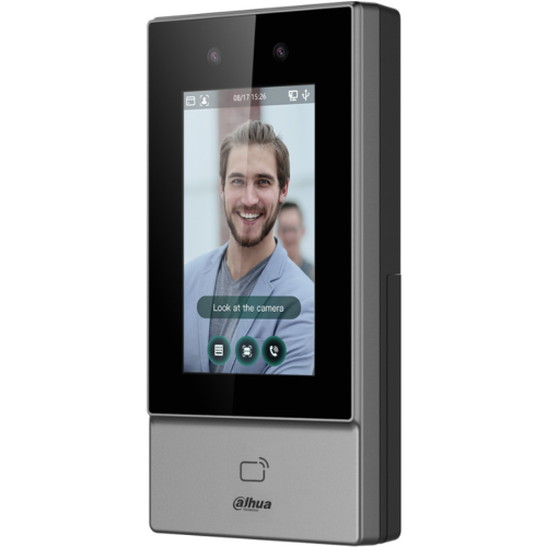 -Terminal/WiFi i mrežni kontroler za kontrolu pristupa sa Full HD DWDR kamerom za prepoznavanje lica, mifare čitačem, senzorom za otisak prsta i virtuelnom tastaturom-4.3" kapacitivni ekran osetljiv na dodir (rezolucija 480x272)-2MP CMOS dual-lens kamera, DWDR, sa IC svetlom-Preciznost prepoznavanja 99.9%-Brzina prepoznavanja 0.2s-Visina/Udaljenost detekcije lica 1.1-2.0m/0.3-1.5m-Udaljenost očitavanja kartice 0 cm–3 cm-Podržava do 6.000 korisnika, 10.000 kartica, 6.000 šablona lica i 6.000 šifri-Memorija 300.000 događaja-Do 128 vremenskih rasporeda-Podrška za detekciju maske na licu i sigurnosnog šlema-Podrška za QR kod posetioca i funkcija pozivne table (video poziv)-Glasovna obaveštenja-Funkcije kontrole pristupa: Anti-passback, multi-user autentifikacija-Intrusion alarm, Duress alarm, Tamper alarm-Bazer-1x USB 2.0, 1x RS485-1x Wiegand-3x ulaza (stanje vrata x1, REX x1, alarm IN x1)-1x Alarm OUT-1x detekcija statusa vrata-1 rele (brava x1)-RJ45 (10/100M), WiFi IEEE802.11b/802.11g/802.11n 2.4GHz-Protokoli: UDP, TCP, IPv4, RTSP, SIP, P2P, RTP-Interoperabilnost: CGI, ONVIF-OSDP protokol-SDK i API-Napajanje PoE ili 12V/1.5A, potrošnja 12 W-Kućište od plastike ojačano staklenim vlaknima-Dimenzije 180.1 mm × 90.1 mm × 27.0 mm-Masa 0.70kg-Radna temperatura -30°C-+60°C-IP65 stepen zaštite-U pakovanju sa napojnim adapterom i zidnim nosačem
