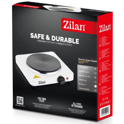 Ploča od livenog gvožđaPodesivi termostatSignalna lampicaZaštita od pregrevanjaNoge koje ne klizePrečnik: 185 mmSnaga: 1500 WElektrična ploča za kuvanje 1500W Zilan ZLN-2173, grejni element od livenog gvožđa (jedno polje za kuvanje). -Indikator radnog svetla -Podesivi termostat (sa 5 koraka podešavanja) -Kompaktan, idealan za kucnu upotrebu Male dimenzije ploče za kuvanje (26x26x9,5cm) nude mogucnost lakog skladištenja i transporta -Prečnik površine za kuvanje (oko za kuvanje) ~ 18,5 cm -Lako se čisti -Gumirane noge za sprečavanje klizanja sa površina na kojima ce se postaviti -LED svetlosni indikator -Snaga ~ 1500W -Napajanje ~ AC 230V -50Hz -Dimenzije pakovanja ~ 30,5x30x11,5 cm.-Tip kontrolne table Mehanički-Pozicioniranje prednje kontrolne table-Energetska efikasnost klase A-Materijal Emajlirani čelikFunkcije:Automatsko isključivanje Noge protiv klizanja Termostat Zaštita od pregrevanja Svetlosni indikatorBoja Bela