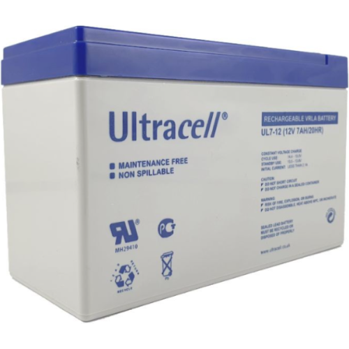 Ultracell UL7-12 olovna VRLA baterija sa klemom F1 (4.8 mm) – stacionarni akumulator. Napona 12V i kapaciteta 7Ah. Idealna za ugradnju u alarmnim sistemima i centralama zbog male kleme. Najpopularnija kod firmi koje se bave ugradnjom i održavanjem alarmnih sistema. Nije preporuka za ugradnju u UPS uređajima. Odlična zamenska baterija od 12V 7Ah je i MHB MS7-12 ili Ritar RT1270, takođe sa uskim klemama.Napon: 12VDimenzije (DxŠxV): 151 × 65 × 99 mmKapacitet: 7AhSastav: VRLA (SLA)Tip: standbyRadni vek: 3-5 godinaDatum uvoza: Jun 2024Konektor klema: Klema F1, 4.8 mmGarancija: 12 meseci