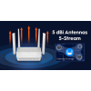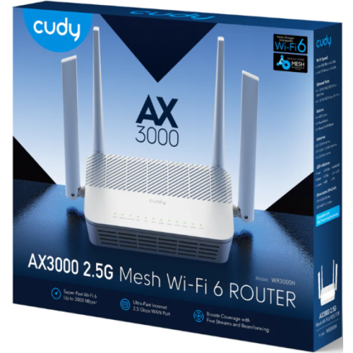 Verzija modela: WR3000H 1.0CPU - Čipset: MT7981- Detalji CPU-a: 1,3 GHz Dual-Core, ARM Cortex-A53Memorija/Skladištenje- Flash/ROM: 128 MB (1 Gbit) NAND- DDR/RAM: 256 MB (2 Gbit) DDR3Wireless - 5 GHz Wi-Fi brzina: 2402 Mbps- 2,4 GHz Wi-Fi brzina: 574 Mbps- 5 GHz Wi-Fi strimuje: 2T2R (2×2 MIMO) sa dodatnim strimom- 2,4 GHz Wi-Fi strimovi: 2T2R (2×2 MIMO)- Wi-Fi antene: 4× fiksno- Maksimalno pojačanje antene od 5 GHz: 5,81 dBi- Maksimalno pojačanje antene od 2,4 GHz: 5,46 dBi- FEM ili PA/LNA: 5 GHz: 3× eksterno; 2,4 GHz: 2× eksterno- Beamforming: True- Performanse dometa: Max. 220 m (722 ft); Unutarnji WiFi opseg varira u zavisnosti od rasporeda i materijala zidova; Pogledajte specifikacije performansi zida za predloge za postavljanje.- Performanse zida: Dva drvena zida debljine < 10 cm (4''); Jedan betonski zid debljine < 20 cm (7'') ili dva betonska zida debljine < 10 cm (4'')Interfejsi - 2.5G RJ45 portovi: 1- Gigabitni RJ45 portovi: 4- Eternet napomene: 2.5G port je VAN port, a gigabitni portovi su LAN portovi- LED: Sistem, Internet, WPS, 2,4 GHz Wi-Fi, 5 GHz Wi-Fi, WAN, LAN- Fizička dugmad: Dugme za uključivanje/isključivanje, WPS dugme, Dugme za resetovanje- Ulaz za napajanje: DC JackPower - Power Methods: DC- DC: 12V 1.5A- Ulaz adaptera za napajanje: 100 ~ 240 V, 50/60 Hz AC- Izlaz: 12V 1.5A DC- Maksimalna potrošnja energije (W): 13WPouzdanost - Okruženje: - Radna temperatura: 0 C ~ 40 C (32 F ~ 104 F)- Temperatura skladištenja: -40 C ~ 70 C (-40 F ~ 158 F)- Vlažnost: 10% ~ 90% bez kondenzacije- Vlažnost skladištenja: 5% ~ 95% bez kondenzacije- Sertifikati: FCC, CE- Mehanička instalacija: Desktop, Montaža na zid- Dimenzije: 173×123,8×33 mm; 6,81×4,87×1,3 inča- Težina proizvoda 347,6 g (12,26 oz.)- Sadržaj paketa: WR3000H, Power Adapter, Ethernet Cable, Uputstvo za instalaciju