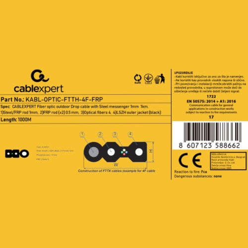 KABL-OPTIC-FTTH-4F-FRP, SM G657A1, LSZH, FLAT GJYXFCH, CABLEXPERT FIBER OPTIC OUTDOOR DROPCABLE WITH STEEL MESSENGER 1MM 1KM/DRUMSPEC: 1)STEEL/FRP ROD 1MM, 2)FRP ROD (X2) 0.5 MM,3)OPTICAL FIBERS 4, 4)LSZH OUTER JACKET (BLACK) ,PRINTING: KABL-OPTIC-FTTH-4F-FRP, SM G657A1, LSZH, FLAT GJYXFCH, CABLEXPERT CE ISO/IEC 11801 001M,002M…… 1000MGembird 4F FTTX Flat Drop kabl je ravan, samonoseci kabl. Korišceno je jednomodno vlakno G657A1 sa smanjenim radijusom savijanja od 10 mm. Korišcene su dve FRP armaturne šipke (fiber Reinforced Polimer) precnika 0,5 mm i dodatna celicna žica od 1 mm. Oklop je napravljen od LSZH (Low Smoke Zero Halogen) - otporan na UV zracenje.– Broj vlakana: 4– Tip vlakna: G.657A1– Boja školjke: crna– Dimenzije: 2×5 mm (debljina x širina)– Težina: 19,5 kg/kmOptički kablTehničke karakteristike-1,0 mm fosfatirana čelična žica kao samonoseca.-2*0,5 mm FRP snage za zaštitu vlakana.-Lako skinite i spojite, pojednostavite instalaciju i održavanje.-Jednostavna struktura, mala težina i visoka praktičnost.-Malo dima, nula halogena plašt.Dimenzije i opisiStandardna struktura GJYXFCH spoljnog kabla:Samonoseca čelična žica: 1x 1,0 mmSnažni član FRP: 2x 0,5mmSpoljni omotač: BLACK LSZHPrečnik kabla: 1-4; 2,0×5,0 mmNeto težina 1-4; 17,5 kg/kmMin. radijus savijanja:Dinamic 30DStatic 15DZatezna čvrstoca:Dugotrajna 300NKratkoročno 600NOtpornost na lomljenje:Dugotrajno 1000N/100mmKratkoročno 2200N/100mmKarakteristike okoline:Temperatura skladištenja -40C~+70CRadna temperatura -30C~+60COptičke karakteristike nakon završetka kabla:Tip vlakna G657A1Slabljenje 1310nm <0,35dB/km 1550nm <0.21dB/kmTalasna dužina preseka <1260nmNAPOMENA:-Kabl koristiti iskljucivo za ono za šta je namenjen.-Ne koristiti kao provodnik visokih napona ili slicno.-Pri povezivanju i instalaciji mreže, obratiti pažnju na redosled provodnika, u suprotnom može doci do oštecenja uredaja ili necete dobiti željeni signal.