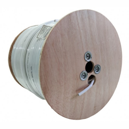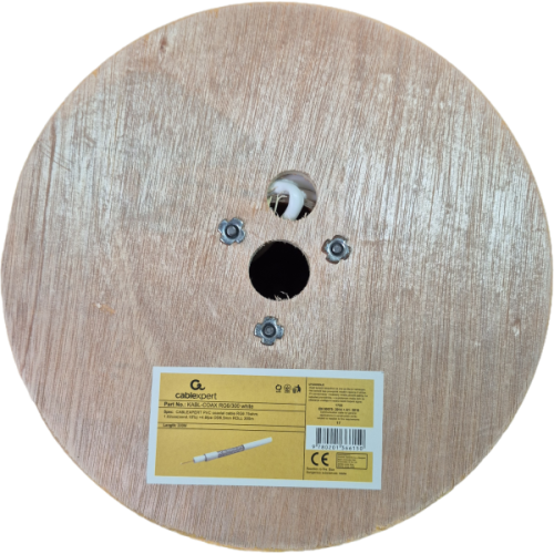 RG6 cable 300m/Drum white spec:1.02ccs(18%)+4.6fpe+??+48/0.12AL+OD;6.5MM PVC Print on sticker: CABLEXPERT RG6 COXIAL CABLE 75 ohm 001m…300m Koaksijalni kabl RG-6, 6.5mm 40 žica u opletu + 1 x Al Provodljivost 18% Celik obložen bakrom Visoki kvalitet izrade Kotur: 300m
