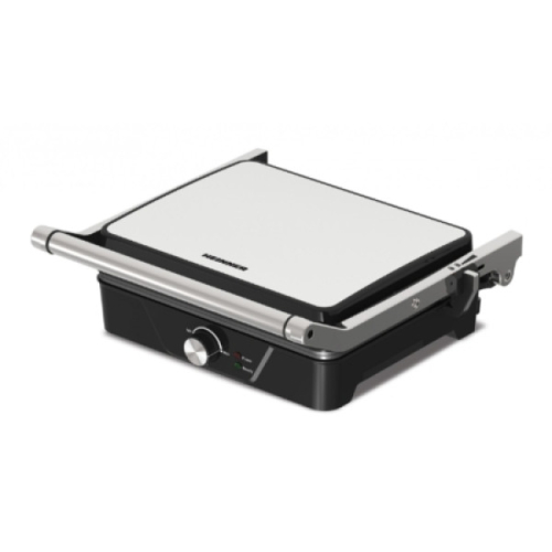 Električni roštilj Heinner HEG-K2000CP, 2000V, fiksne ploče sa nelepljivim premazom, podesiva temperatura, otvaranje od 180˚ stepeni, hladna ručka na dodir, svetla za napajanje i spremnost, odvojiva posuda za kapanje, srebrna boja.