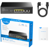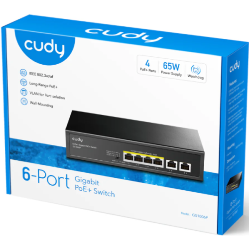 Interfejsi Gigabitni RJ45 portovi: 6Gigabitni RJ45 PoE portovi: #1~#4Maksimalna snaga na jednom PoE portu: 30WNapomene o PoE portovima: PoE portovi su u skladu sa IEEE 802.3at/af standardima.Portovi proširenog režima: #3~#4VLAN režim Portovi: #1~#4LED: Power, DIP režim (SV): Link/ACT svakog Ethernet portaUlaz za napajanje: AC UlazFizička dugmad: VLAN/Default/Extend DIP prekidačFizička dugmad Napomena: PoE Vatchdog je uključen u VLAN/Ektend režimima i pokušaće da ponovo pokrene priključeni, ali neaktivan klijent.Performanse Brzina bakra i udaljenost: - Cat. 3 ili veći kabl: 100 metara pri 10 Mbps- Cat. Kabl od 5 ili više: 100 metara pri 100 Mbps- Cat. 5e ili viši kabl: 100 metara na Gigabitu- Cat. 5e ili viši kabl: 250 metara pri 10 MbpsNapomena o brzini i udaljenosti od bakra: Prenos od 250 metara je dostupan samo na portovima proširenog režima kada je aktiviran prošireni režim.Tabela MAC adresa: 2048Maksimalni kapacitet prebacivanja: 12 GbpsMaksimalna brzina prosleđivanja 8.928 MppsJumbo okvir: 9 KBBafer paketa: 1 MbitNapajanje Načini napajanja: ACAC: 100-240V~, 50/60HzNapajanje: 65WMaksimalna snaga bez PoE: 5WPrebacivanje 802.3 protokoli:- 802.3i 10BASE-T- 802.3u 100BASE-TKS- 802.3ab 1000BASE-T- 802.3k kontrola protoka- 802.3af PoE- 802.3at PoEPouzdanost Metode uzemljenja: Utikač sa tri zupcaEMS: IEC/EN 61000-4-2, nivo 3 ESD: Kontakt: 6kV; Vazduh: 8kV; IEC/EN 61000-4-5, Nivo 4 Prenapon: Snaga: DM 2kV, CM 4kV; RJ45: CM 4kVRadna temperatura okoline: 0~40 C (32~104 F)Temperatura skladištenja: -40~70C (-40~158F)Radna vlažnost: 10~90% bez kondenzacijeVlažnost skladištenja: 10~95% bez kondenzacijeDimenzije 200×118×44 mm; 7,87×4,65×1,73 inčaMaterijal kućišta: MetalInstalacija: Desktop, Montaža na rack preko nosača (nosači nisu uključeni u kutiju)Sadržaj paketa GS1006PPower CordUputstvo za instalaciju