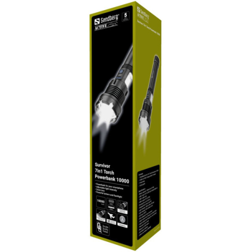 Sandberg Survivor 7 u 1 Torch eksterna baterija 10000 je savršena za kampovanje ili dobro planinarenje u prirodi. Dobićete širok spektar korisnih funkcija u jednom uređaju: Snažna LED baterijska lampa sa više nivoa osvetljenja i sočivom za zumiranje, bočna lampa sa više funkcija i opcijom crvenog svetla. Ugrađena punjiva baterija radi kao baterija za svetlo, a može se koristiti i kao eksterna baterija za punjenje pametnog telefona putem ugrađenog USB konektora. Robusno izrađena u aluminijumskom dizajnu sa IPx4 sertifikatom, tako da je možete bezbedno nositi sa sobom u teškim uslovima. Pored toga, ojačani vrh baklje može se koristiti kao čekić u hitnim slučajevima.