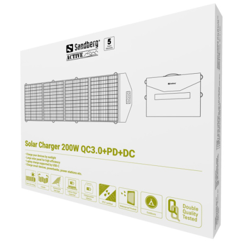 Sandberg solarni punjač 200 W je solarni panel visokih performansi koji može da generiše energiju direktno iz sunčeve svetlosti. Zbog velike površine, panel proizvodi dovoljno energije za svu vašu mobilnu opremu - čak i za laptopove, eksterne baterije i velike power stations. Panel je opremljen Quick Charge USB-A priključkom, USB-C priključkom visokih performansi kao i DC 5521 izlazom. Ravno položite panel ili ga nagnite prema sunčevoj svetlosti pomoću postolja koje se montira direktno na proizvod. Robusni i materijal otporan na vremenske prilike. Sklopiv radi lakšeg transporta i skladištenja.