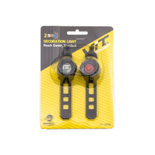 Set aluminijumskih punjivih LED svetala za bicikl, sa indikatorom. Osvetljenje je malo i kompaktno, ali dovoljno daje svetlosti da se vidi u saobraćaju. Domet svetlosti im je 800m. Zahvaljujući izuzetno lakoj montaži, pomoću gumenih traka, i kompaktnom dizajnu, ovo osvetljenje je lako za nošenje i sastavljanje. Funkcije seta: 100% osvetljenost (4h), 50% osvetljenost (8h), treptanje (30h), isključeno.