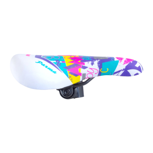 Sedište 3701129 za dečiji Mtb sa interesantnim i aktuelnim printom, na šine i katadiopterom pozadi, što doprinosi bezbednosti.