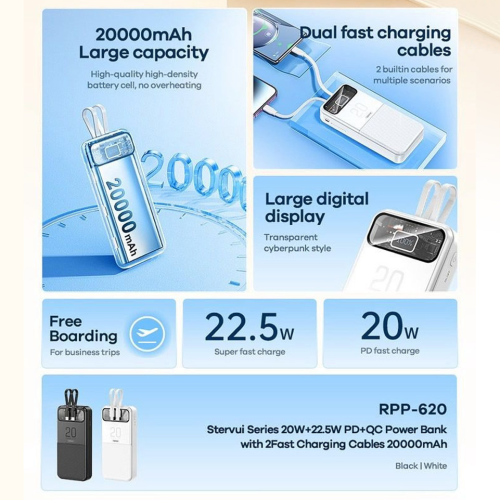 POWER BANK PRENOSIVA BATERIJA REMAX STERVUI SERIES RPP-620 PD 20W + QC 22.5W FAST CHARGING 20000MAH BELA