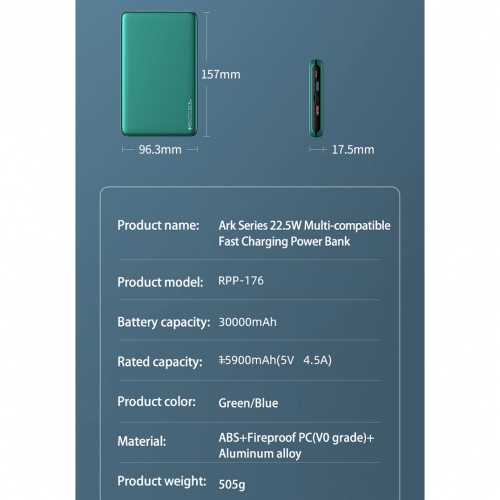 POWER BANK PRENOSIVA BATERIJA REMAX RPP-176 22.5W 30000MAH ZELENA