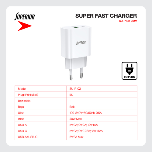 KUCISTE PUNJACA SUPERIOR SU-P102 20W SUPER FAST USB A QC3.0+TYPE C BELO (CERT)