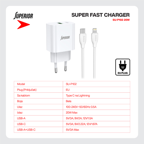 KUCNI PUNJAC SUPERIOR SU-P102 20W SUPER FAST USB A QC3.0+TYPE C SA TYPE C NA LIGHTNING KABLOM BELI (CERT)
