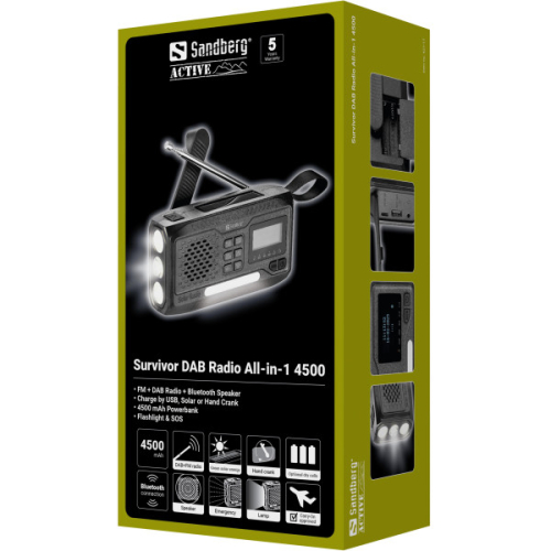 Sandberg Survivor DAB Radio All-in-1 4500 je kompaktan i izdržljiv uređaj koji kombinuje više funkcija u jednom. Bilo da ste u divljini ili se suočavate sa hitnom situacijom, ima sve što vam je potrebno. Služi kao eksterna baterija za punjenje vašeg pametnog telefona, Bluetooth zvučnik za strimovanje muzike sa vašeg telefona i radio sa DAB i FM prijemom. Sa ugrađenim solarnim panelom i ručicom za navijanje, možete je puniti kada nema struje, a takođe radi i sa AAA baterijama kao alternativom. Pored toga, pruža svetlost kao baterijska lampa i kao lampa za čitanje. Sandberg Survivor DAB Radio All-in-1 4500 je spreman za svaku situaciju.