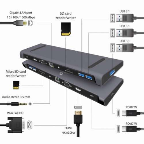Sve funkcije koje su vam potrebne u jednom adapteru.10-u-1 portova: USB hab, 4K HDMI i Full HD VGA video, stereo audio, gigabitni LAN port, čitač kartica i podrška za punjenje preko USB Type-C PD portaPlug & Play-3-portni USB 3.1 Gen 1 (5 Gbps) hab-HDMI port sa podrškom za UHD 4K @30 Hz-VGA Full HD video port-3,5 mm stereo audio izlaz-10/100/1000 Mbps Gigabit LAN port-Èitač/pisač SD i Micro-SD kartica-87 W USB Type-C Power Delivery 3.0 port-Izdržljivo metalno kucište premium stilaUlaz: USB 3.x Type-C muški; dužina kabla 15 cmUSB 3.1 Gen 1 izlaz (5 Gbps): 3 kom. x Type-A (ženski)HDMI izlaz: Type-A (ženski), maksimalna rezolucija: 4K @ 30 HzUSB Type-C PD port: Max. PD 2.0 do 87 WLAN: Gigabitni, RJ45 portÈitač SD kartica: SD i MikroSD formati, podržava kartice do 128 GBVGA 1920 x 1080 @60 Hz video i 3,5 mm stereo audio priključciPotrošnja energije: 5 V DC, do 0,2 ADimenzije: 277 x 74 x 20 mmNeto težina: 0,248 kgZahteva: USB Type-C video izvor mora da podržava DisplayPort™ Alt režim
