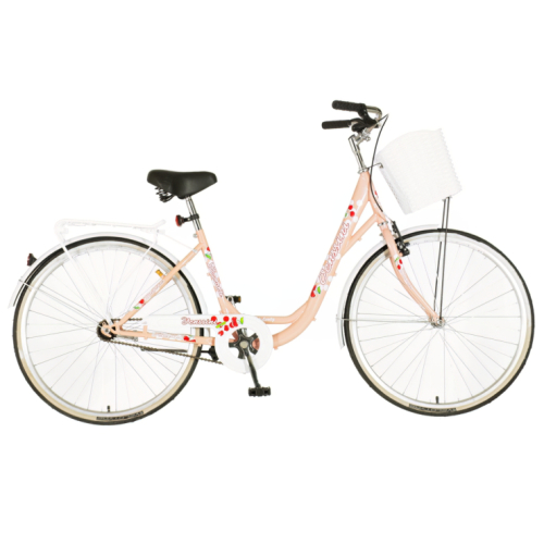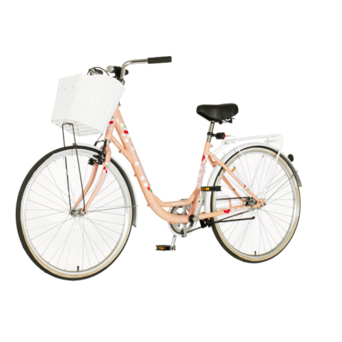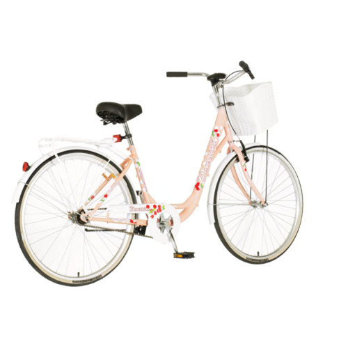 Romantični ženski bicikl za uživanje u gradskoj vožnji. Prelepa kombinacija boja ističe ovaj model u odnosu na druge, odiše prolećnim bojama i motivima. Detalji sa višnjama podižu celu priču. Sedište je udobno i komforno, poseduje pletenu korpu u beloj boji, takođe ima i zadnji paktreger. Veličina točkova od 26x1.3/8”, garantuje udobnu i laganu vožnju. Ram je čelični, zahvajujući kome je bicikla vrlo izdržljiva.