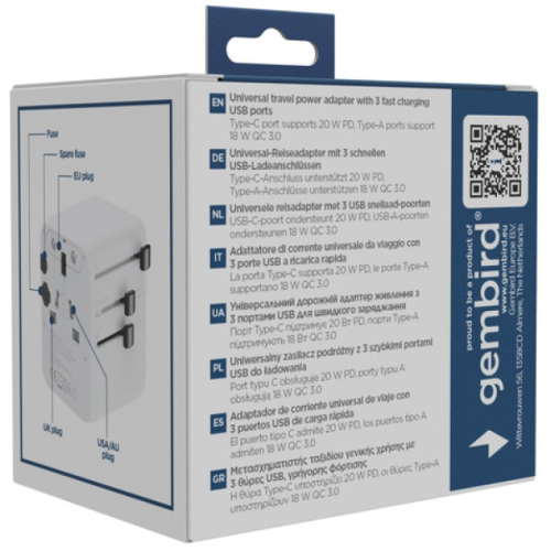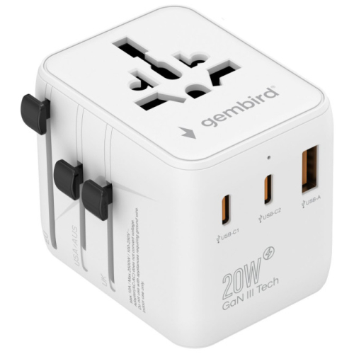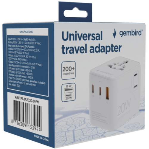 CISTA SNAGAUniverzalni putni adapter pogodan za upotrebu u preko 200 zemaljaLagan i jednostavan za upotrebu dizajn: savrsen za putovanjaPrakticni integrisani USB brzi portovi za punjenje vaseg pametnog telefonaPodrzava rad jednom rukom- Univerzalni putni adapter za napajanje sa 3 USB porta za brzo punjenje- Prakticna univerzalna AC uticnica podrzava vecinu tipova utikaca- GaN tehnologija: kompaktan dizajn i povecana energetska efikasnost- Type-C port podrzava 20 W PD, Type-A portovi podrzavaju 18 W QC 3.0- Ukljucuje US/UK/EU/AU utikace, radi u preko 200 zemalja- AC uticnica sa zastitnim roletnama za decu- Zasticeno osiguračem od 10AUlaz: 100-250 V~, 50/60 Hz, 0,5 ANapon: 100-250 V~, 10,0 A (maks. 2500 W)Tip utikaca: Velika Britanija/Evropa/SAD/AustralijaIzlaz C1/C2: 5,0 V= 3,0 A, 9,0 V= 2,22 A, 12,0 V= 1,67 A (maks. 20,0 W)Izlaz A1: 5,0 V= 3,0 A, 9,0 V= 2,0 A, 12,0 V= 1,5 A (maks. 18,0 W)Izlaz C1/C2 + A1: 5,0 V= 3,0 A (maks. 20,0 W ukupno)Potrosnja energije u stanju pripravnosti: <0,1 WEfikasnost pri 25% opterecenja: >85,40%Efikasnost pri 100% opterecenja: >87,22%Prosecna efikasnost u aktivnom stanju: >86,31%Osigurac: 10 A (u skladu sa BS1362)