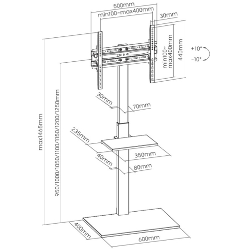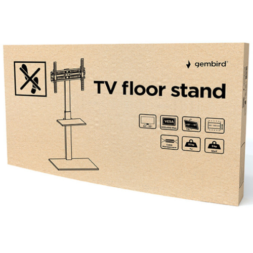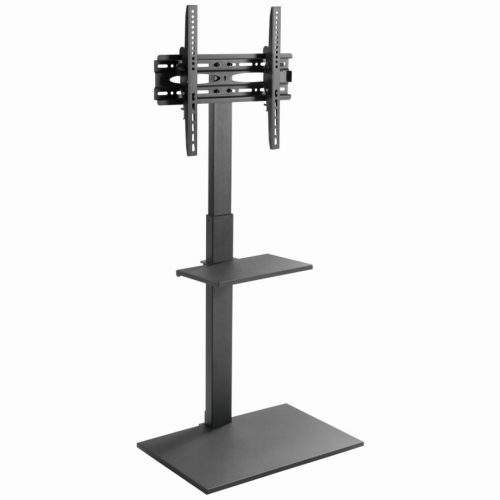 Postavite svoj TV uz zid bez potrebe za busenjem rupaStilski minimalisticki dizajn se uklapa u svaku dnevnu sobu ili kancelarijuPrakticno upravljanje kablovima integrisano unutar stuba drzi kablove skrivenim i organizovanim- Metalni podni stalak za TV- Podrzava vecinu LCD televizora od 32” - 55”- Omogucava naginjanje do 20 stepeni- Jednostavno podesavanje visine televizora pomocu brzog otpustanja opruge- Prakticna polica za opremu ili materijal- VESA kompatibilno, maks. 400 mm x 400 mmMaterijal: Celik, plastika, ivericaBoja: crnaPodrzana velicina ekrana: 32" - 55"VESA podrska: 100x100, 200x100, 200x200, 300x200, 400x200, 300x300, 400x300, 400x400Nosivost televizora: 35 kgNosivost police: 5 kgPodesavanje visine: 1165 - 1465 mmOpseg nagiba: + - 10 °Opseg okretanja: n/dUpravljanje kablovima: DaDimenzije: 600 x 400 x 1165-1465 mm