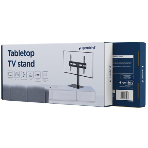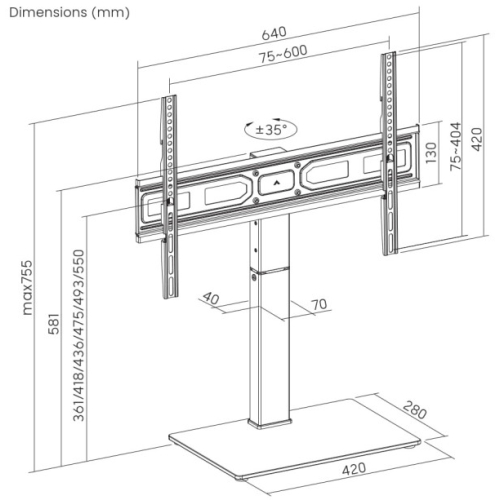 Moderan dizajn sa postoljem od kaljenog staklaIntegrisana prakticna funkcija upravljanja kablovima minimizira vidljivost kablovaObrtna baza omogucava rotiranje televizora u savrsen ugao gledanja- Stono TV postolje- Podrzava vecinu LCD televizora od 37” - 75”- Omogucava okretanje do 70 stepeni- Podesavanje visine u 6 stepeni odgovara razlicitim velicinama televizora i omogucava bolju visinu gledanja- VESA kompatibilno, maks. 600 mm x 400 mm- Integrisano upravljanje kablovimaMaterijal: Celik, plastika, kaljeno stakloBoja: crnaPodrzana velicina ekrana: 37" - 75"VESA podrska: 75x75, 100x100, 100x150, 150x100, 100x200, 200x100, 150x150, 200x200, 300x200, 400x200, 300x300, 400x300, 400x400, 600x400Nosivost: 40 kgPodesavanje visine: 361 / 418 / 436 / 475 / 493 / 550 mmOpseg okretanja: -35°/+35°Ugao nagiba televizora: n/dUpravljanje kablovima: Da